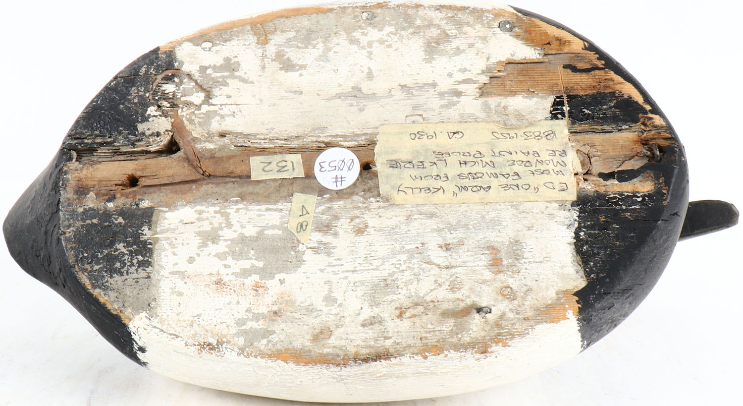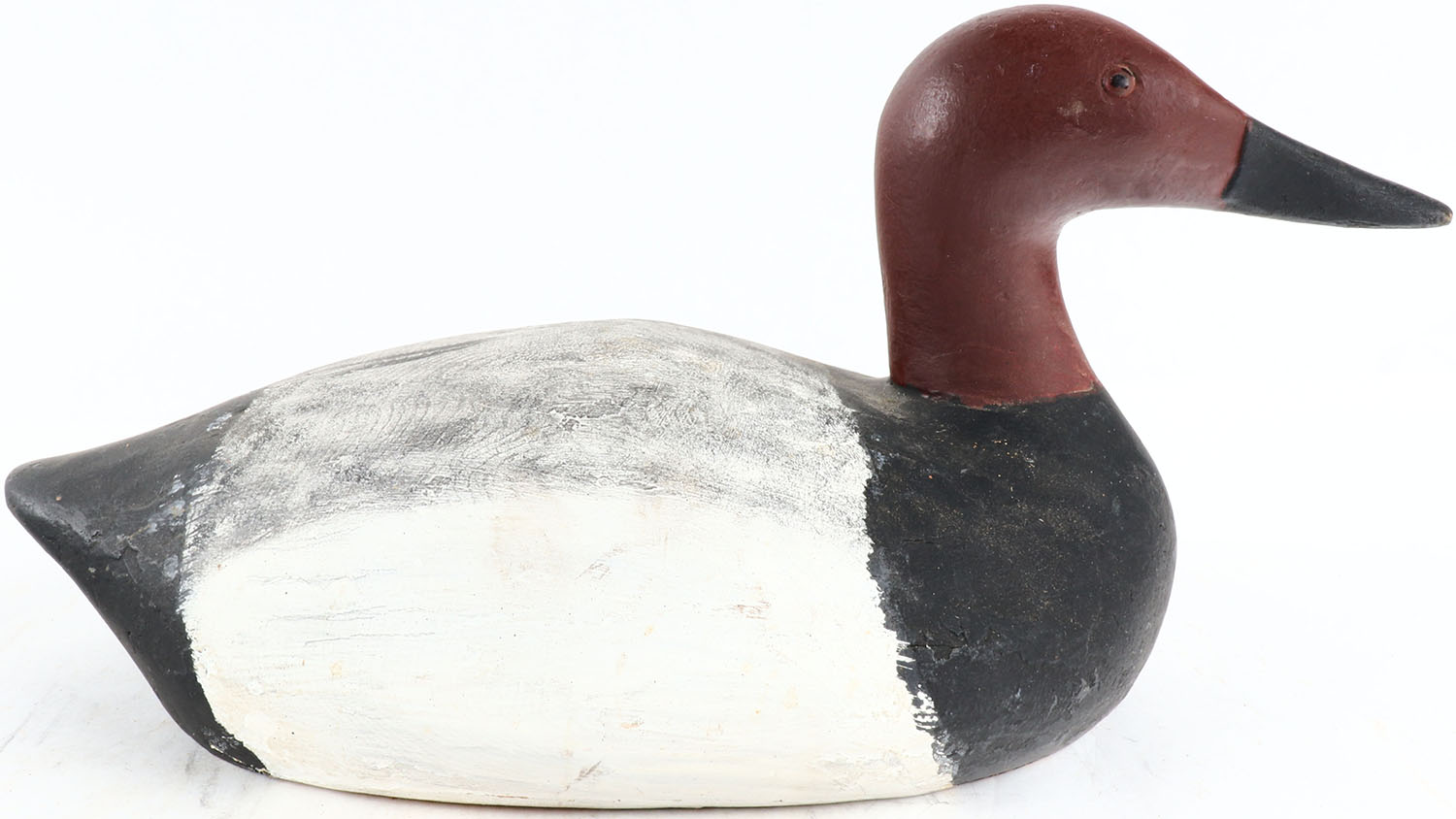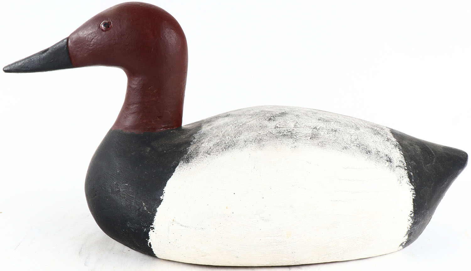Canvasback Drake attributed to One-Armed Ed Kelly, Monroe, MI, glass eyes, solid wood, repainted, structurally excellent. Grade: Excellent + - Value: 50 to 200