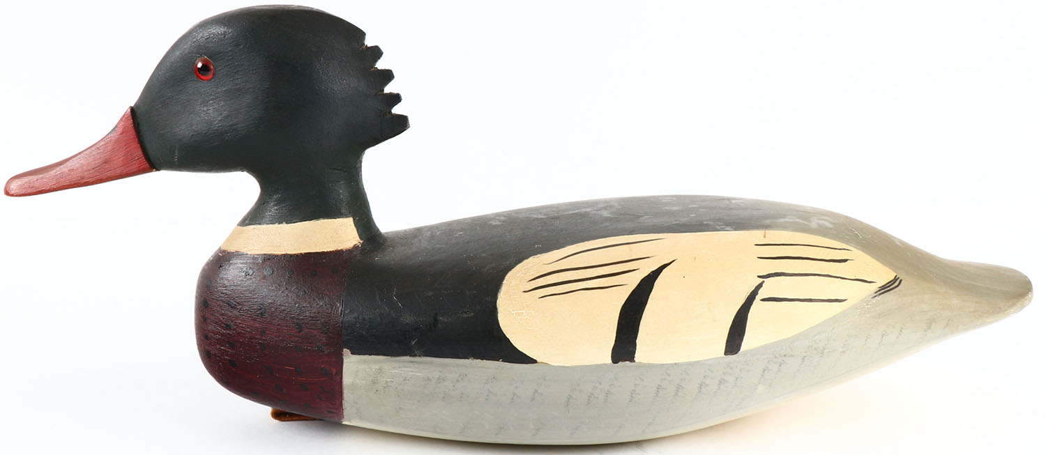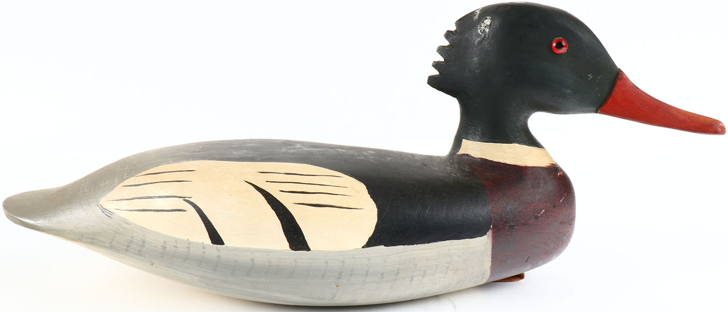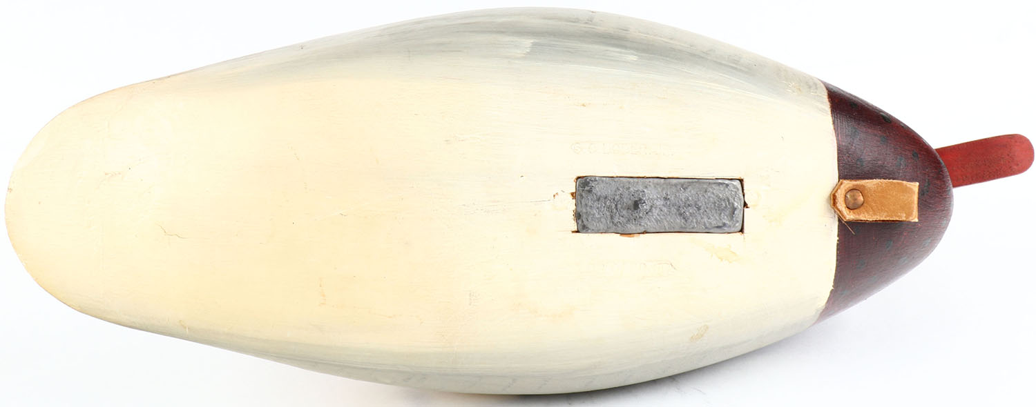 Hooded Merganser by G.O. Loder, Jr. glass eyes, hollow wood, original paint, structurally excellent, branded G.O. LODER JR on bottom. Grade: Excellent - Value: 40 to 200