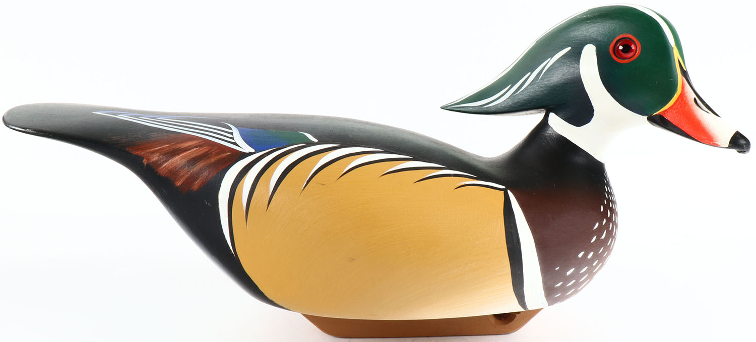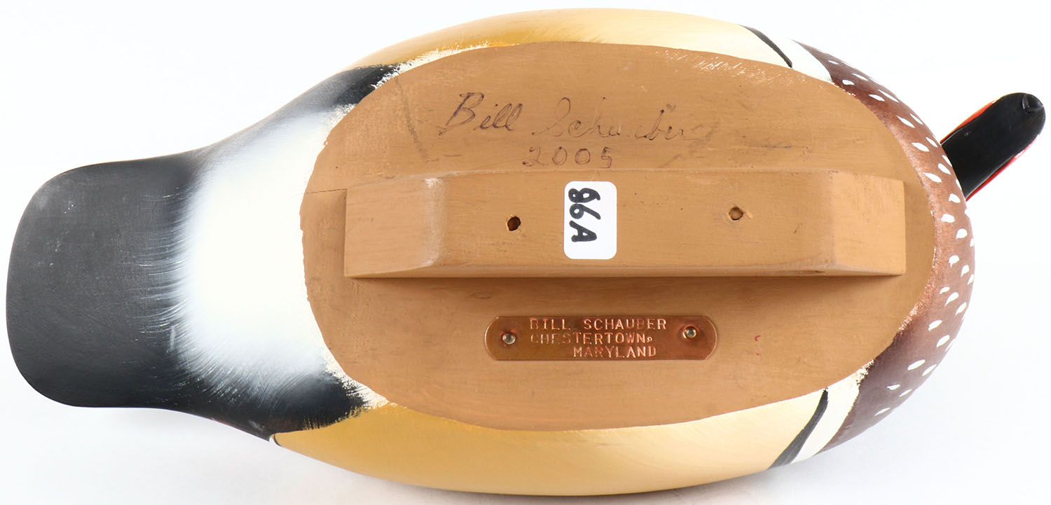 Woodduck Drake by Bill Schauber, Chestertown Maryland, glass eyes, hollow wood, original paint, structurally excellent, signed on bottom. Grade: MINT - Value: 50 to 150