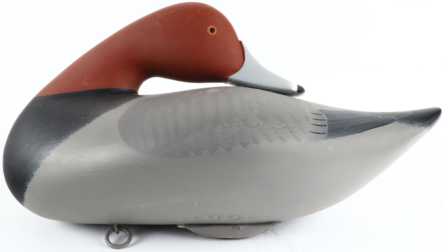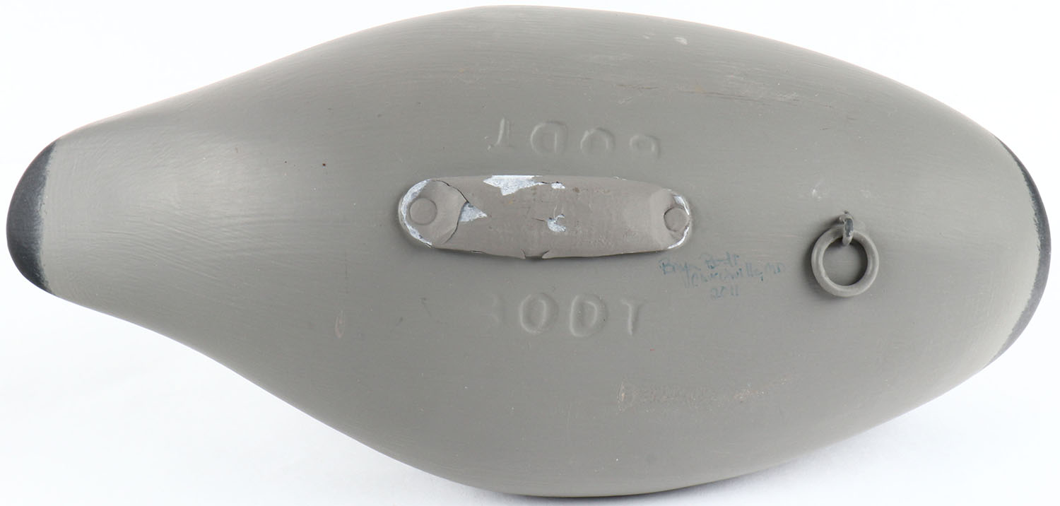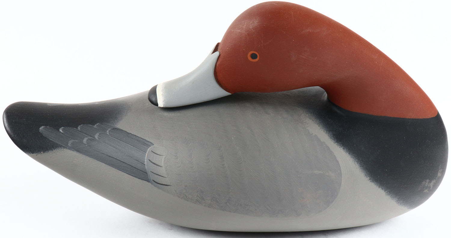 Preening Redhead Drake by Bryon Bodt, Churchille MD, painted eyes, solid wood, original paint, structurally excellent, signed and branded on bottom. Grade: MINT - Value: 50 to 100
