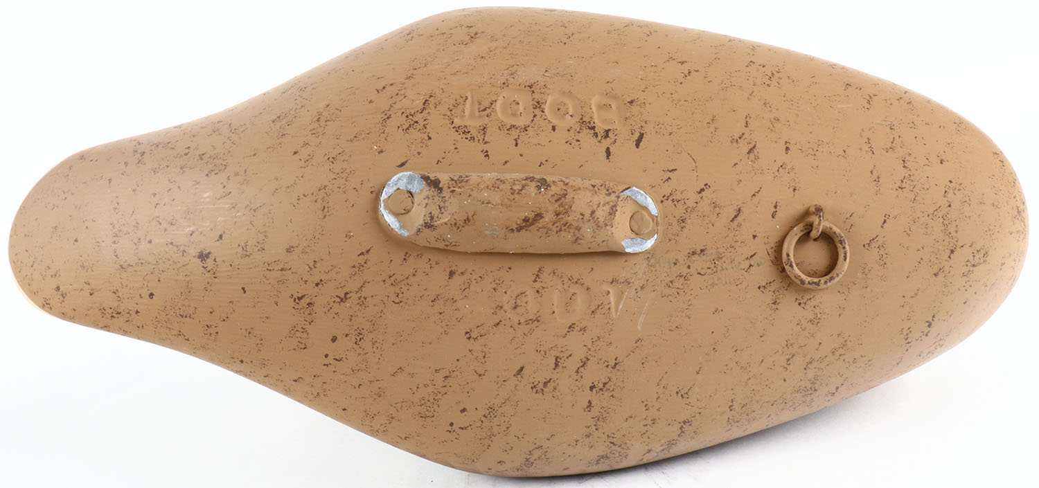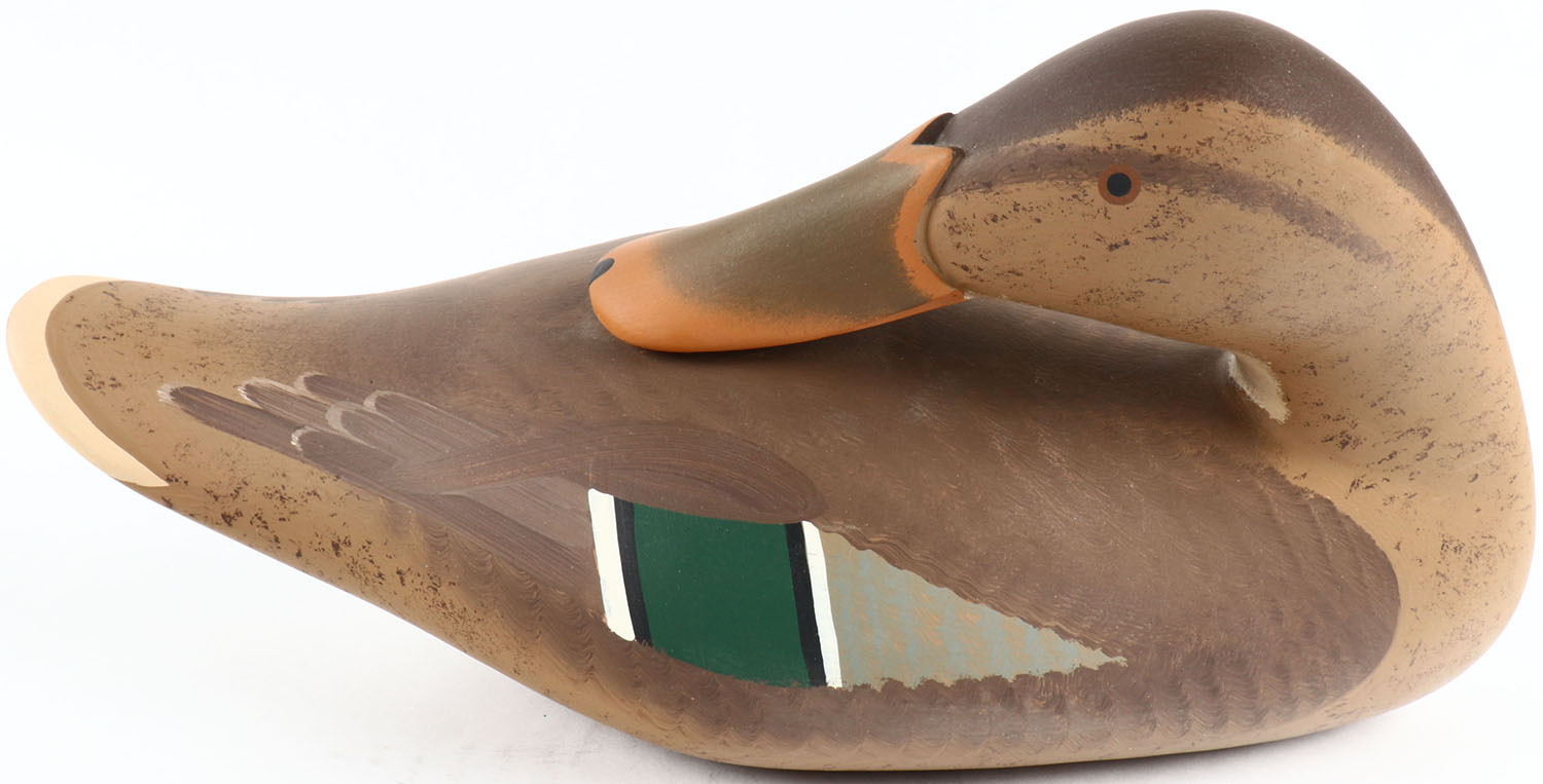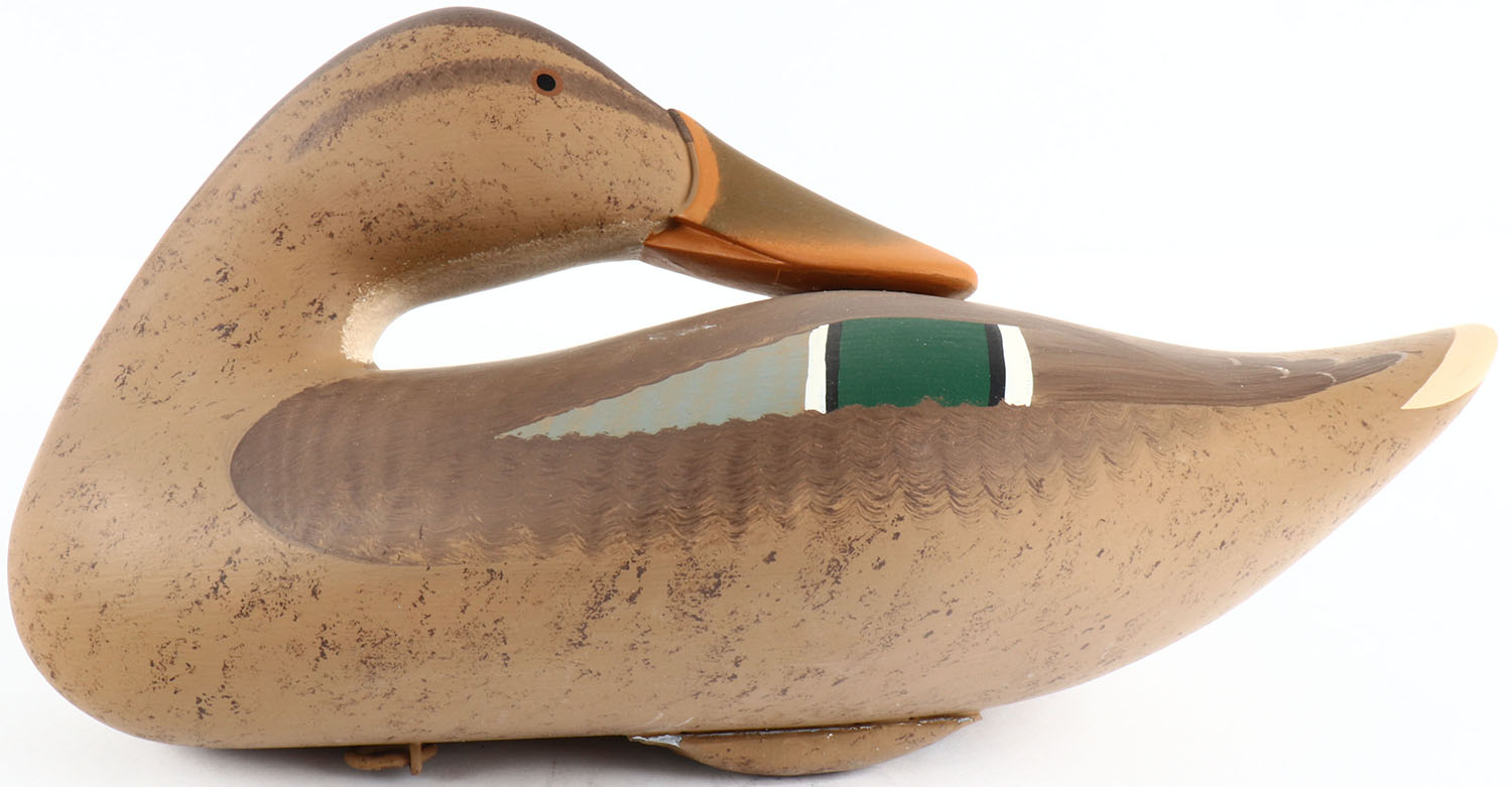 Preening Mallard Hen by Bryon Bodt, Churchille MD, painted eyes, solid wood, original paint, structurally excellent, branded BODT on bottom. Grade: MINT - Value: 50 to 100