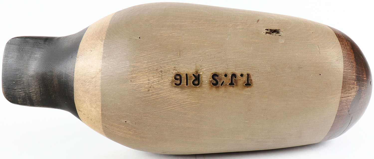Mallard Drake by T.J.'S RIG, glass eyes, solid wood, original paint, structurally excellent, branded T.J.'S RIG on bottom. Grade: Excellent ++ - Value: 50 to 100