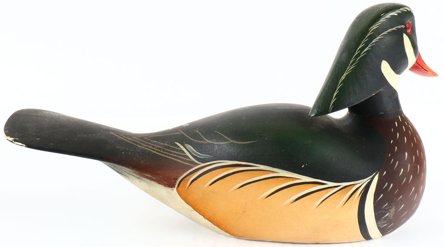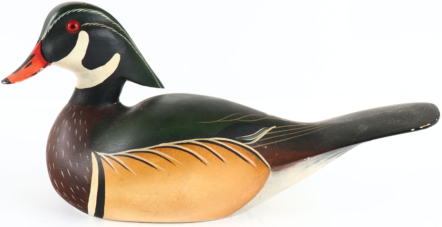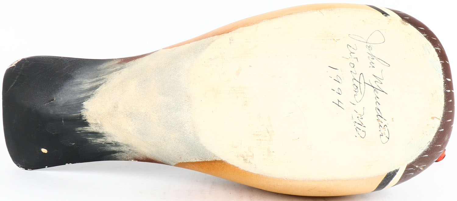 Woodduck Drake by John Meridith, Morton, MD, glass eyes, hollow wood, original paint, structurally excellent, signed on bottom. Grade: Excellent - Value: 50 to 100