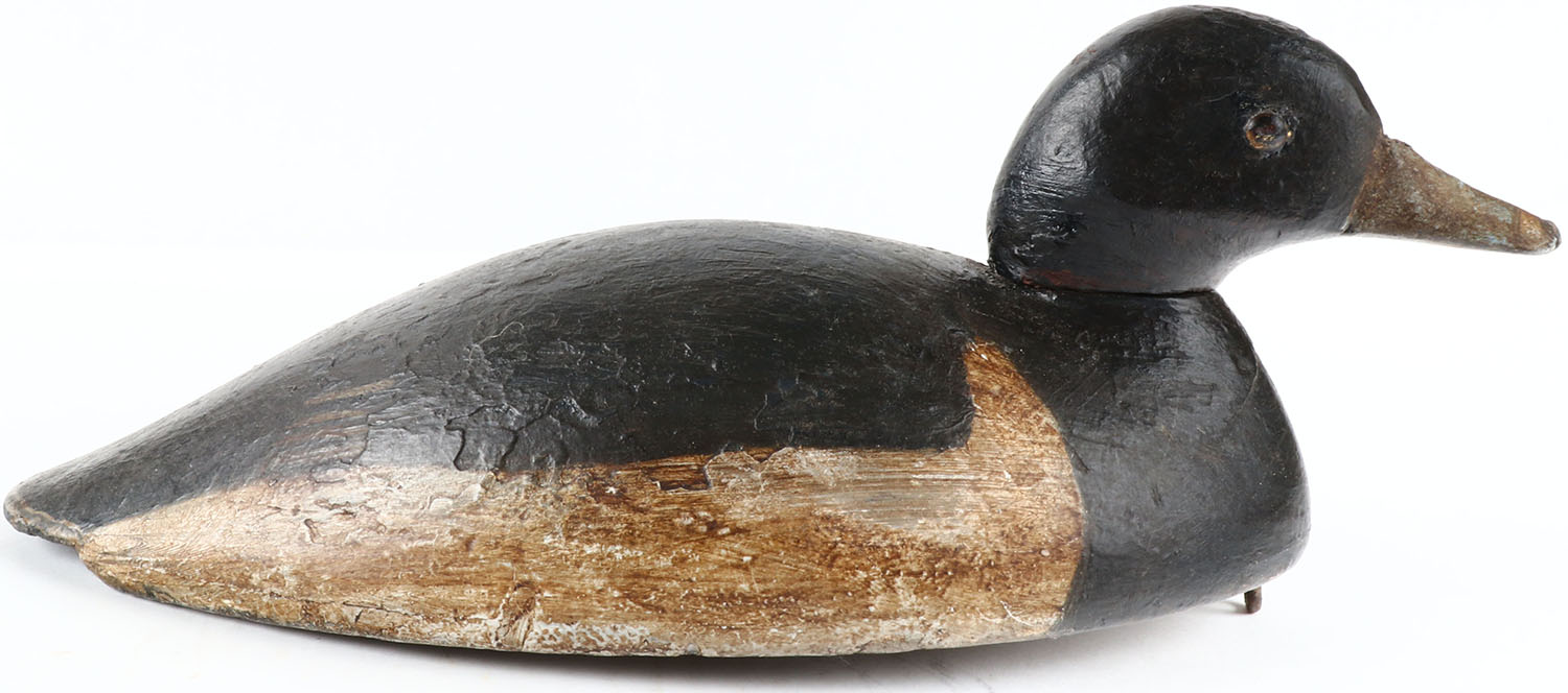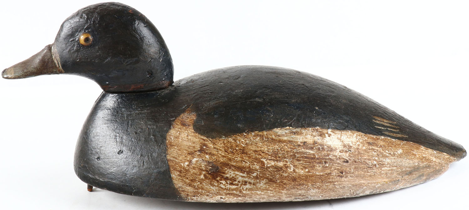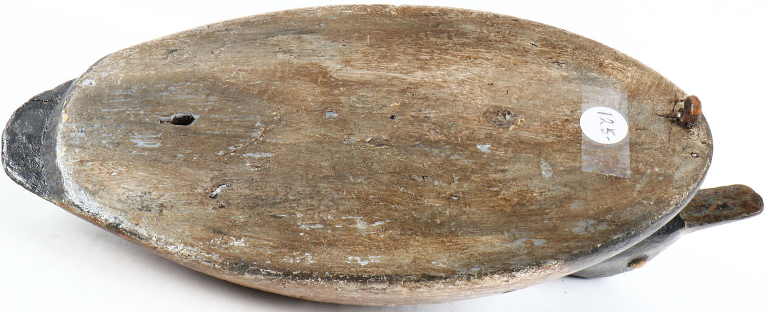 Blue Bill Drake by unknown maker, glass eyes, hollow wood, original paint, head is loose. Grade: Very Good ++ - Value: 50 to 150