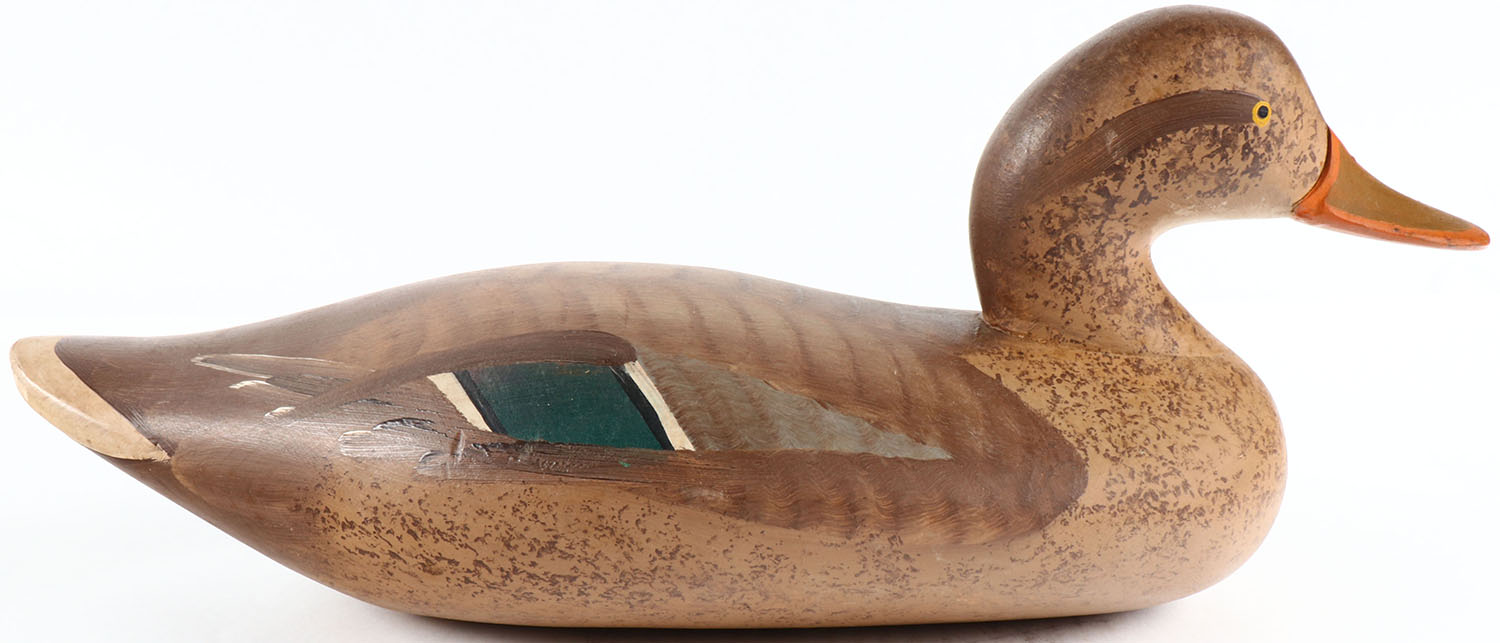 Mallard Hen by unknown maker, painted eyes, solid wood, original paint, structurally excellent. Grade: MINT - Value: 50 to 150