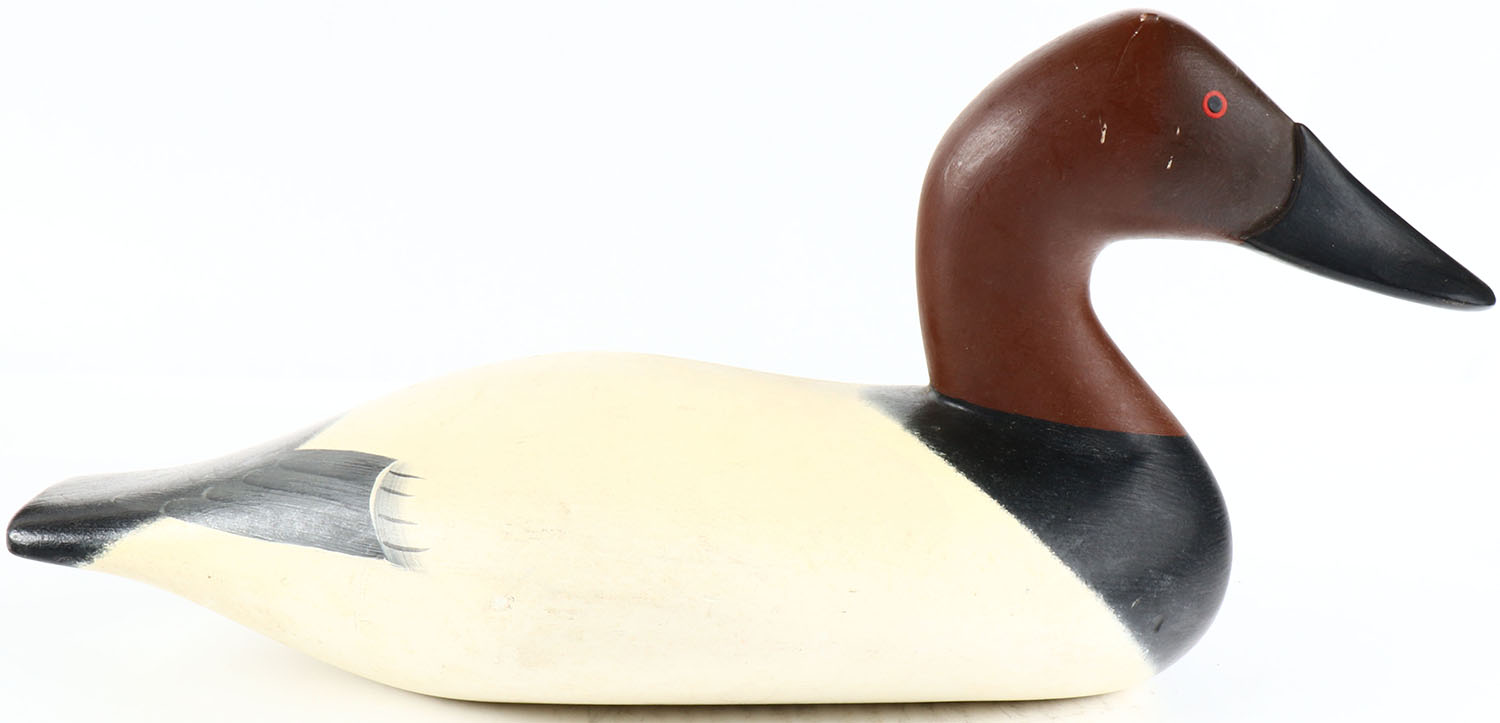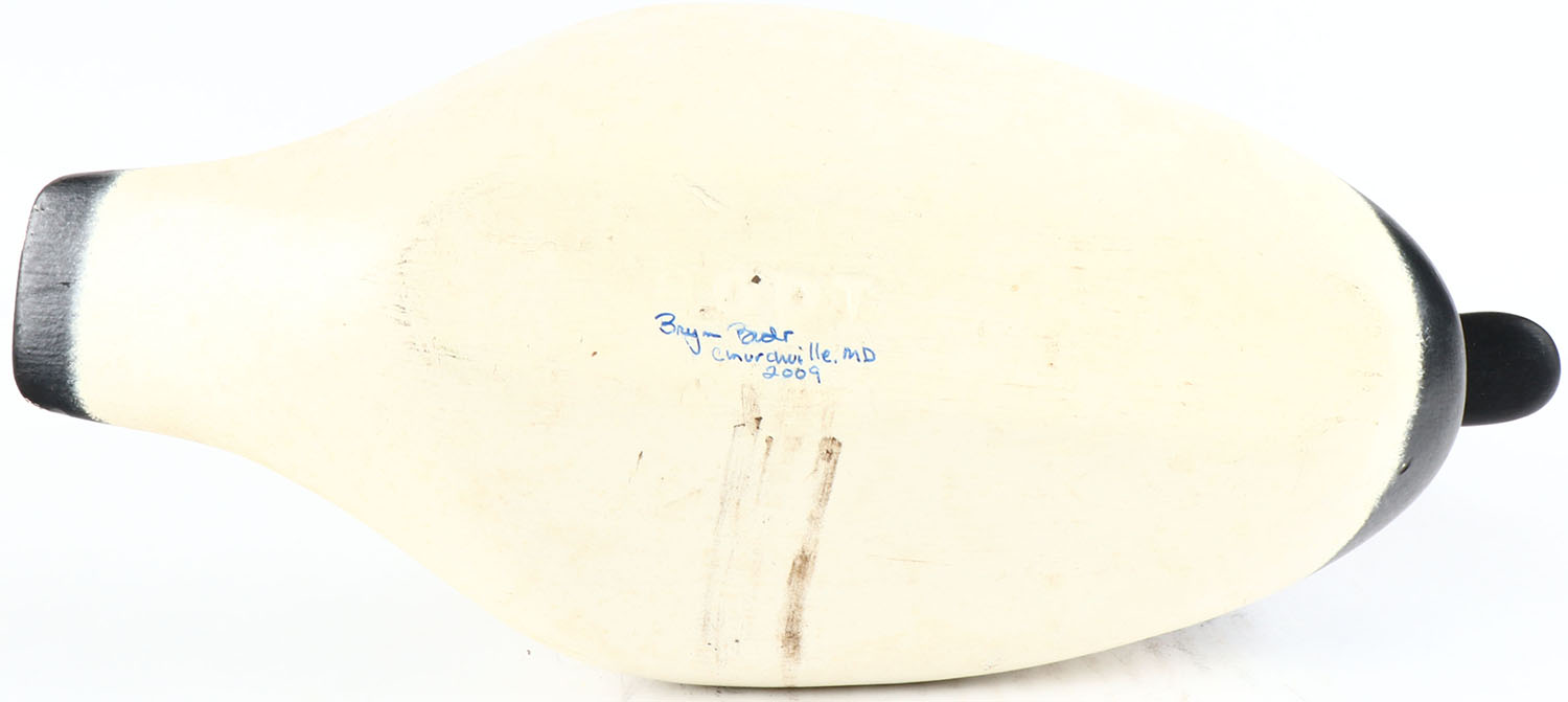 Canvasback Drake by Bryon Bodt, Churchille MD, painted eyes, hollow wood, original paint, structurally excellent, signed on bottom. Grade: Excellent ++ - Value: 50 to 100