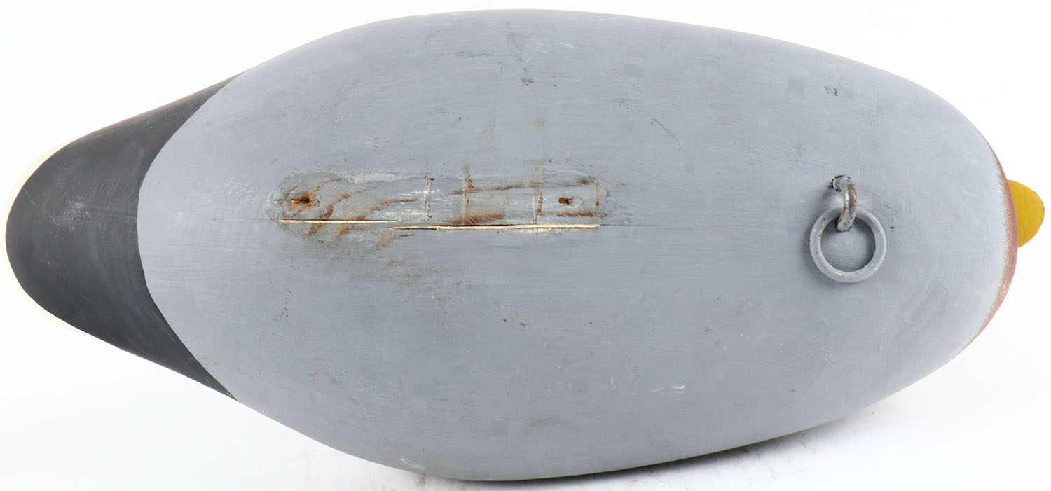 Mallard Drake by unknown maker in MD, painted eyes, solid wood, repainted, has age crack on bottom. Grade: Very Good ++ - Value: 50 to 100