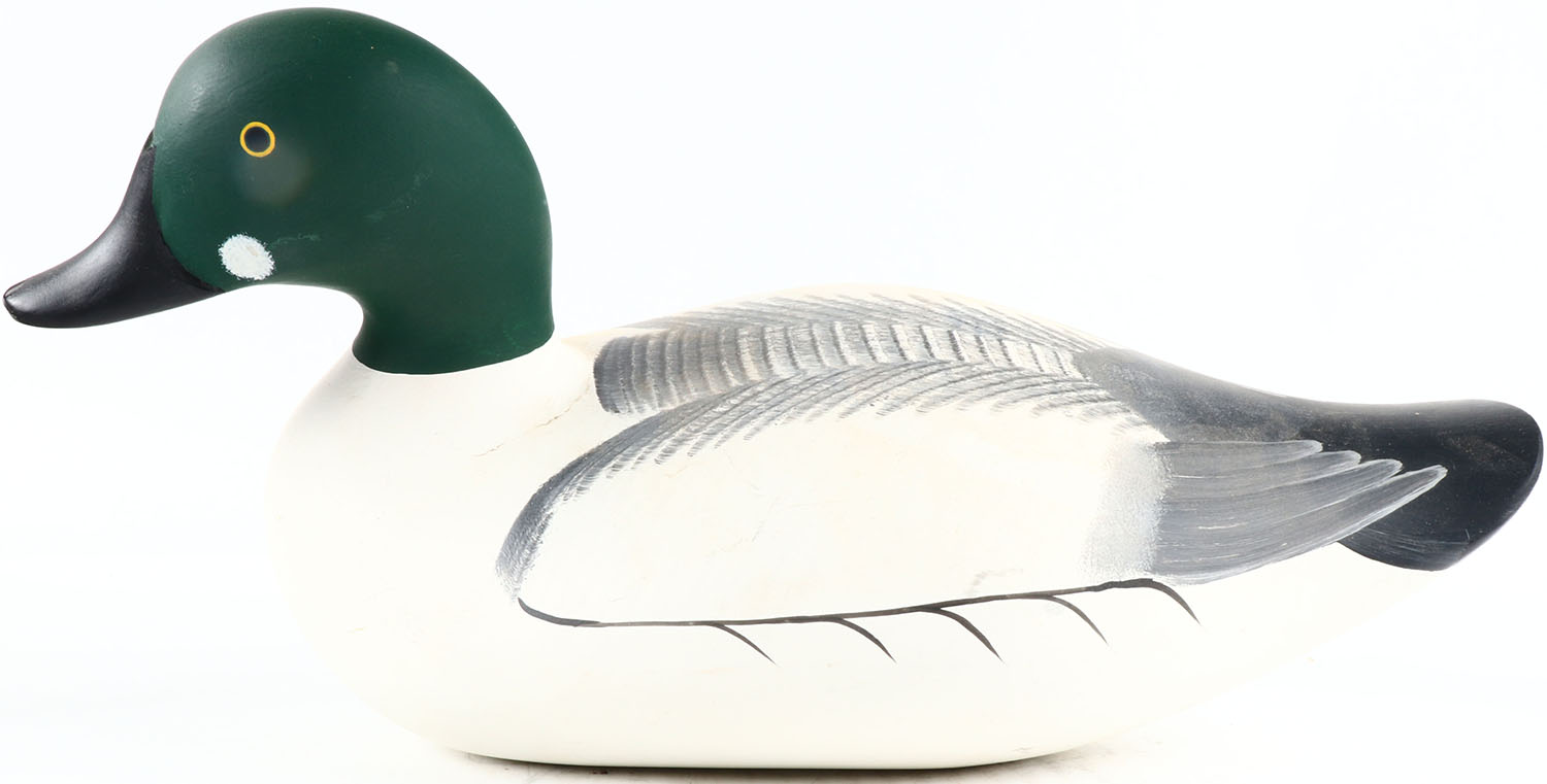 Goldeneye Drake by Patrick ''Pat'' Vincent, Churchville, MD, painted eyes, solid wood, original paint, has age cracks on bottom of body and under head, signed on bottom. Grade: Very Good ++ - Value: 50 to 150