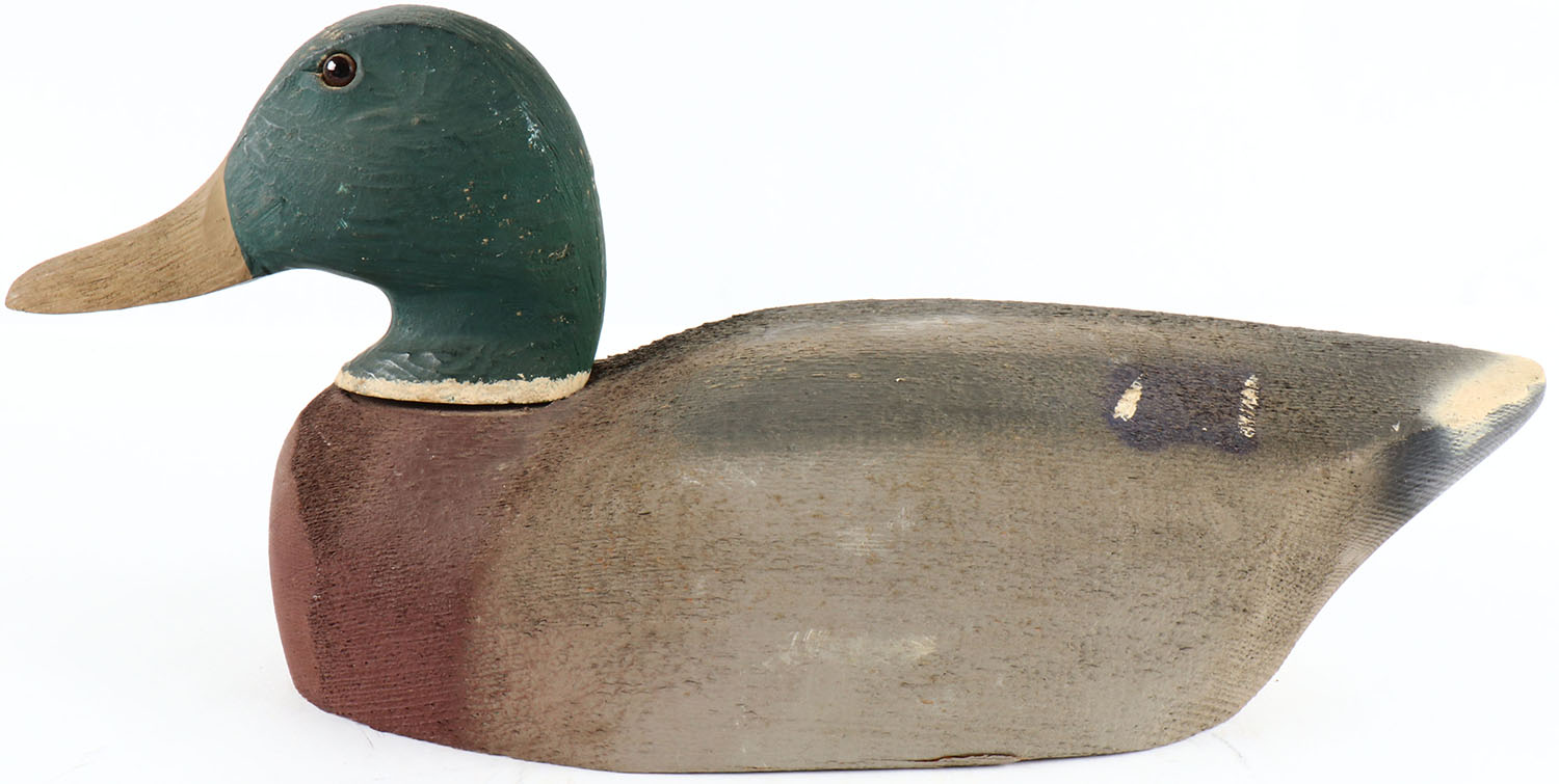 Mallard Drake by Herter's Inc, glass eyes, hollow wood, original paint, head comes off. Grade: Very Good ++ - Value: 50 to 100