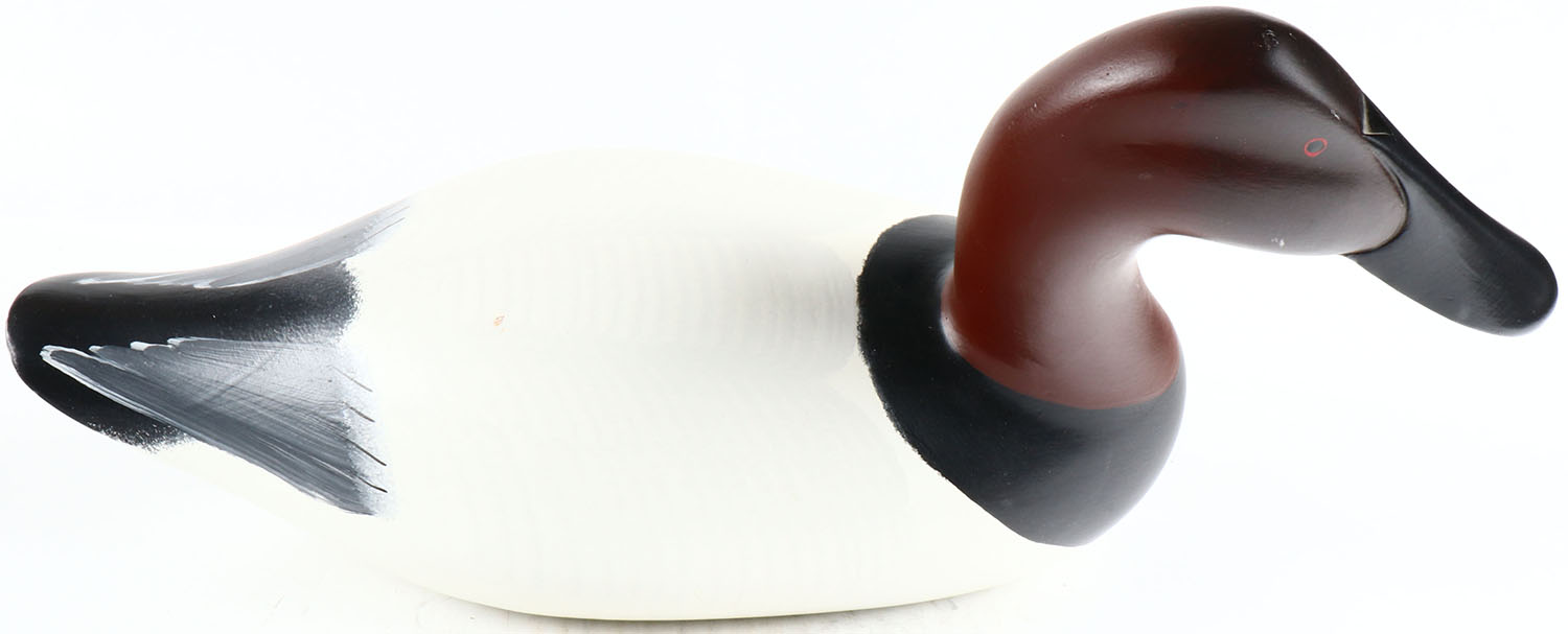 Canvasback Drake by John N Clark, painted eyes, solid wood, original paint, structurally excellent, signed on bottom. Grade: MINT - Value: 50 to 100