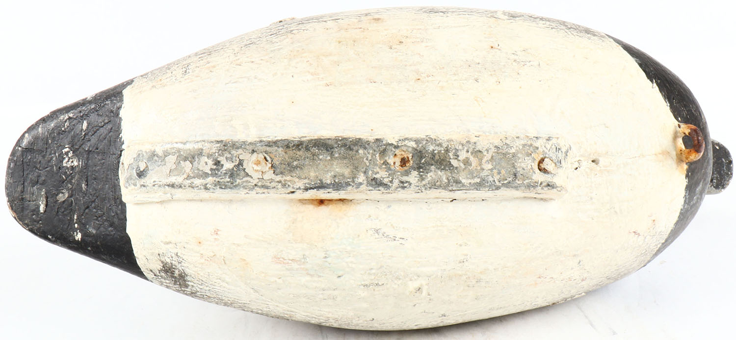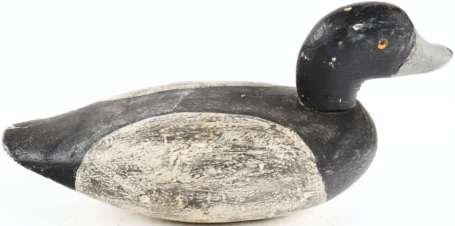 Bluebill Drake by unknown maker, painted eyes, solid wood, original paint, has age cracks on back. Grade: Very Good ++ - Value: 50 to 100