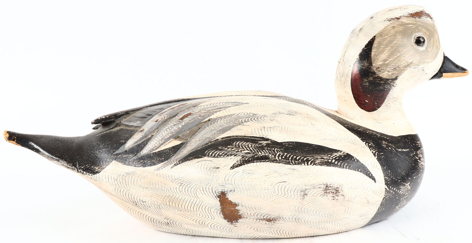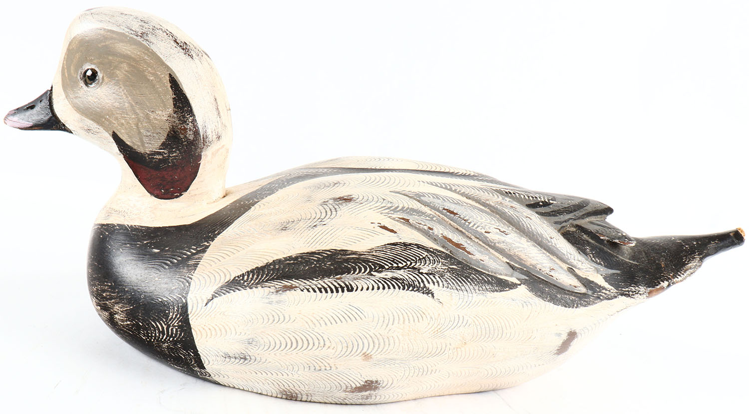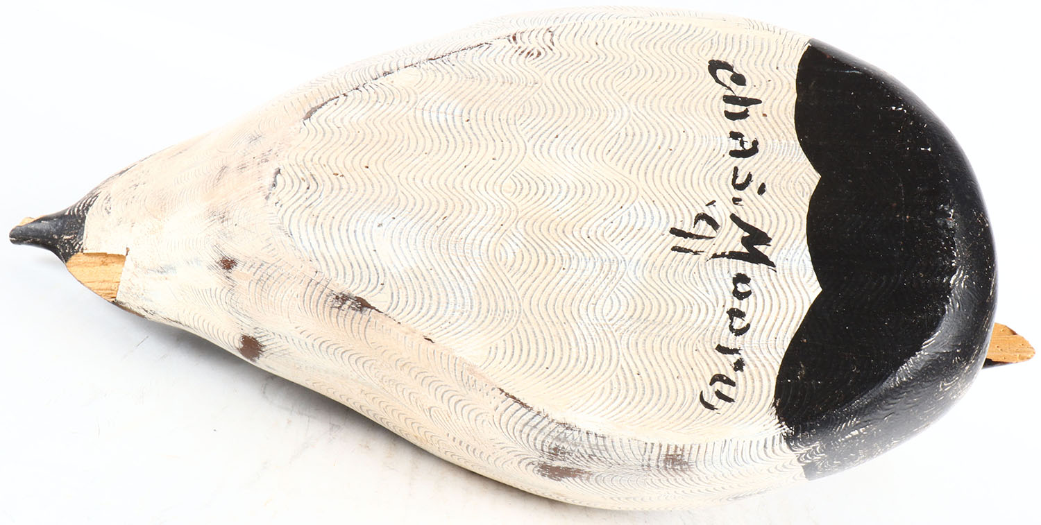 Old Squaw by Chase Moore, glass eyes, solid wood, original paint with comb painting, bill is broken and bottom of tail is broken, signed on bottom. Grade: Very Good + - Value: 40 to 80