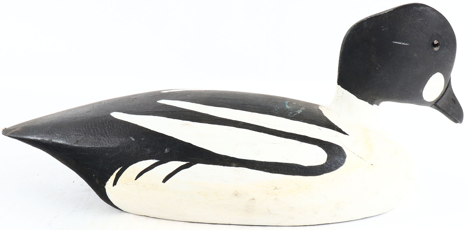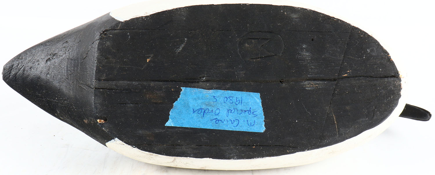 Goldeneye Drake by Maynard Caine, Ontario, Canada, glass eyes, solid wood, original paint, structurally excellent, branded M and signed on bottom. Grade: Excellent - Value: 50 to 100