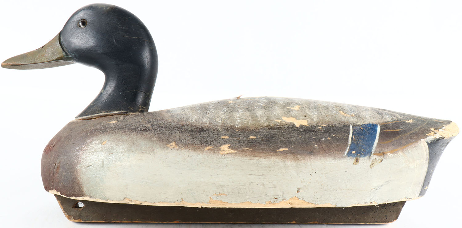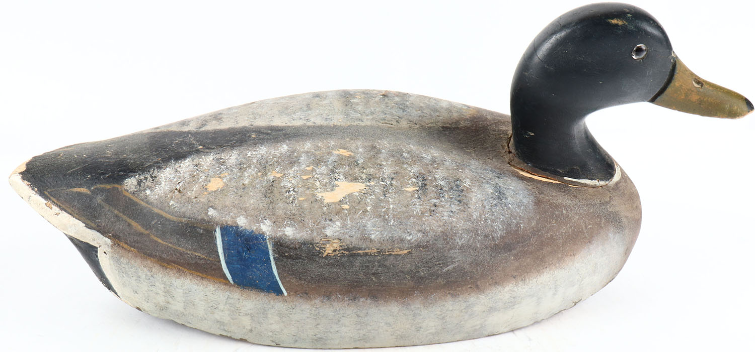 Mallard Drake by Wildfowler, unmarked, glass eyes, solid balsa wood, original paint, head is loose. Grade: Very Good ++ - Value: 30 to 60