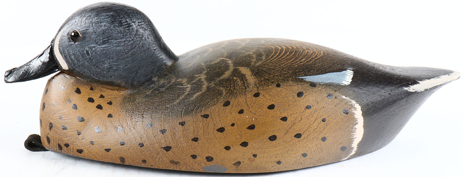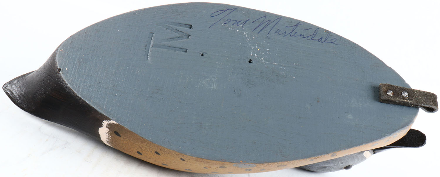 Blue-wing Teal Drake by Tom Martindale, Ontario, Canada, glass eyes, solid wood, original paint, structurally excellent, branded TM and signed on bottom. Grade: MINT - Value: 50 to 100