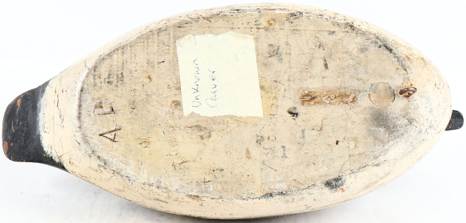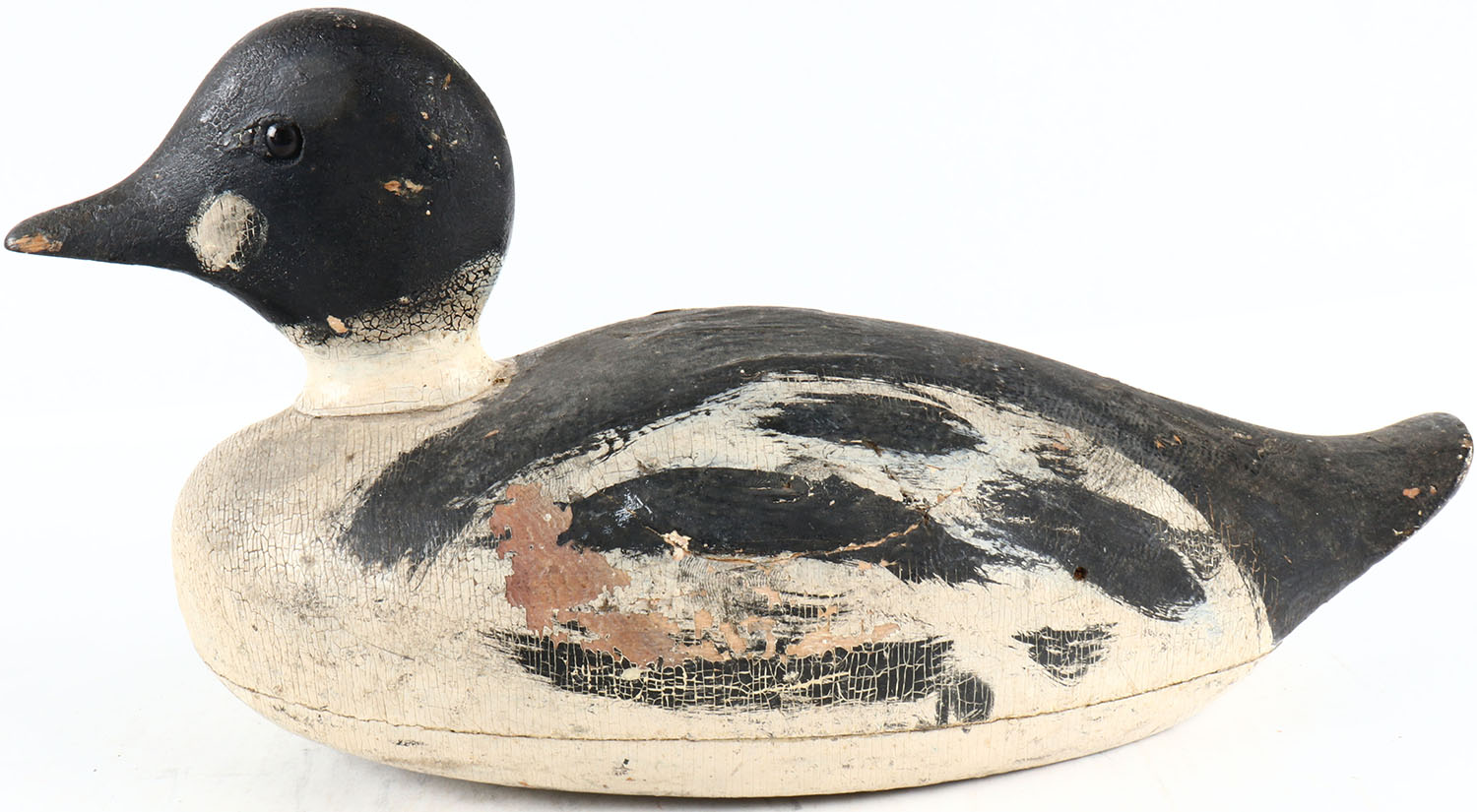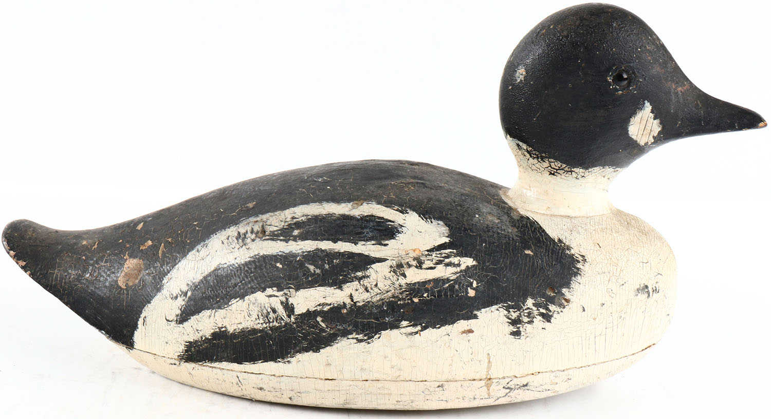 Goldeneye Drake by unknown maker, glass eyes, solid wood, original paint, has age cracks on body. Grade: Very Good ++ - Value: 50 to 100