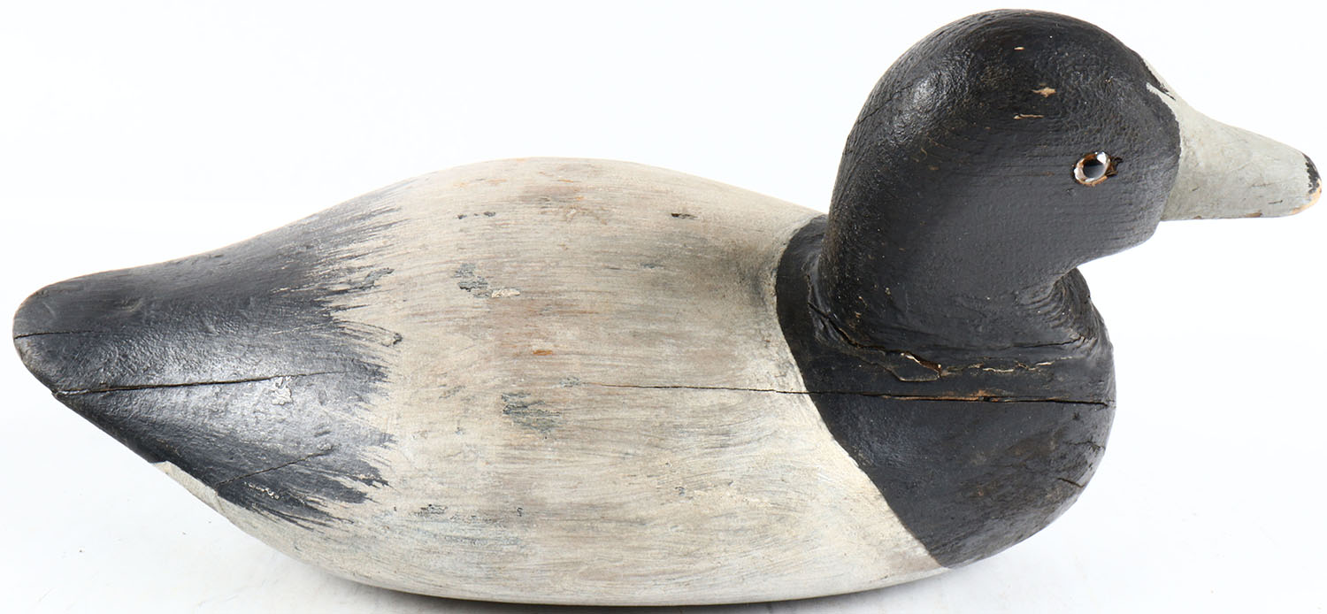 Bluebill Drake by unknown maker, glass eyes, solid wood, original paint, has age cracks on back and bottom. Grade: Very Good ++ - Value: 50 to 100
