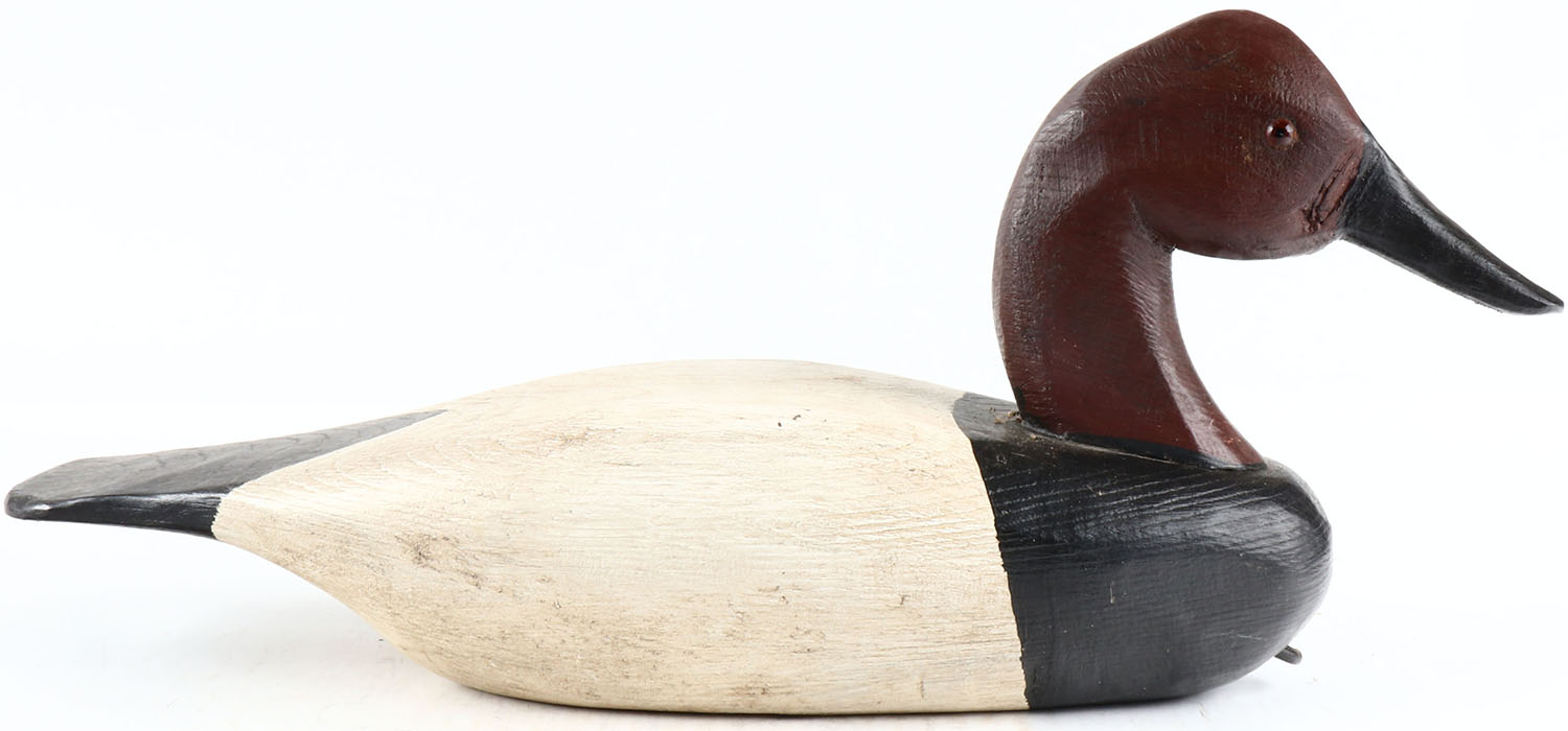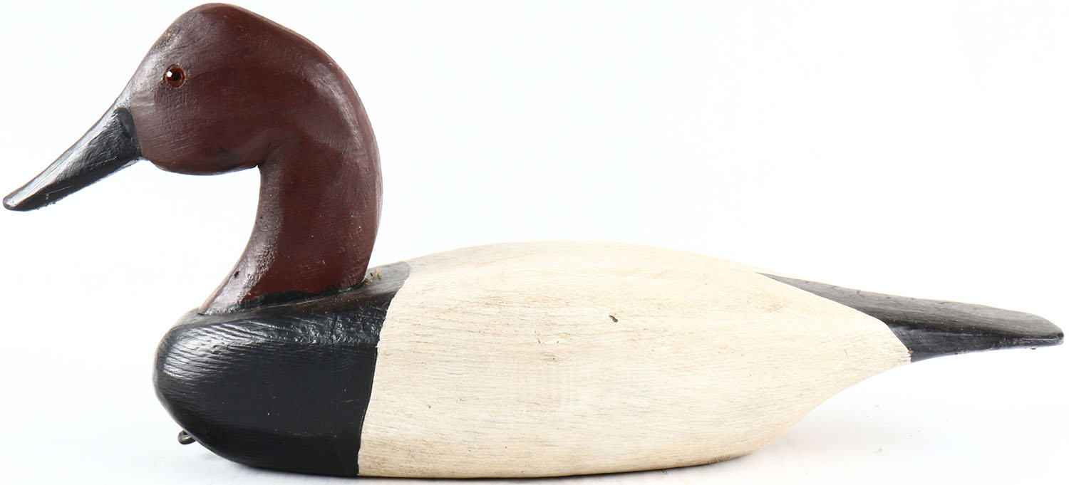 Canvasback Drake by Romie L Waterfield, North Carolina, glass eyes, hollow wood, original paint, structurally excellent, branded RLW on bottom. Grade: Excellent - Value: 50 to 100