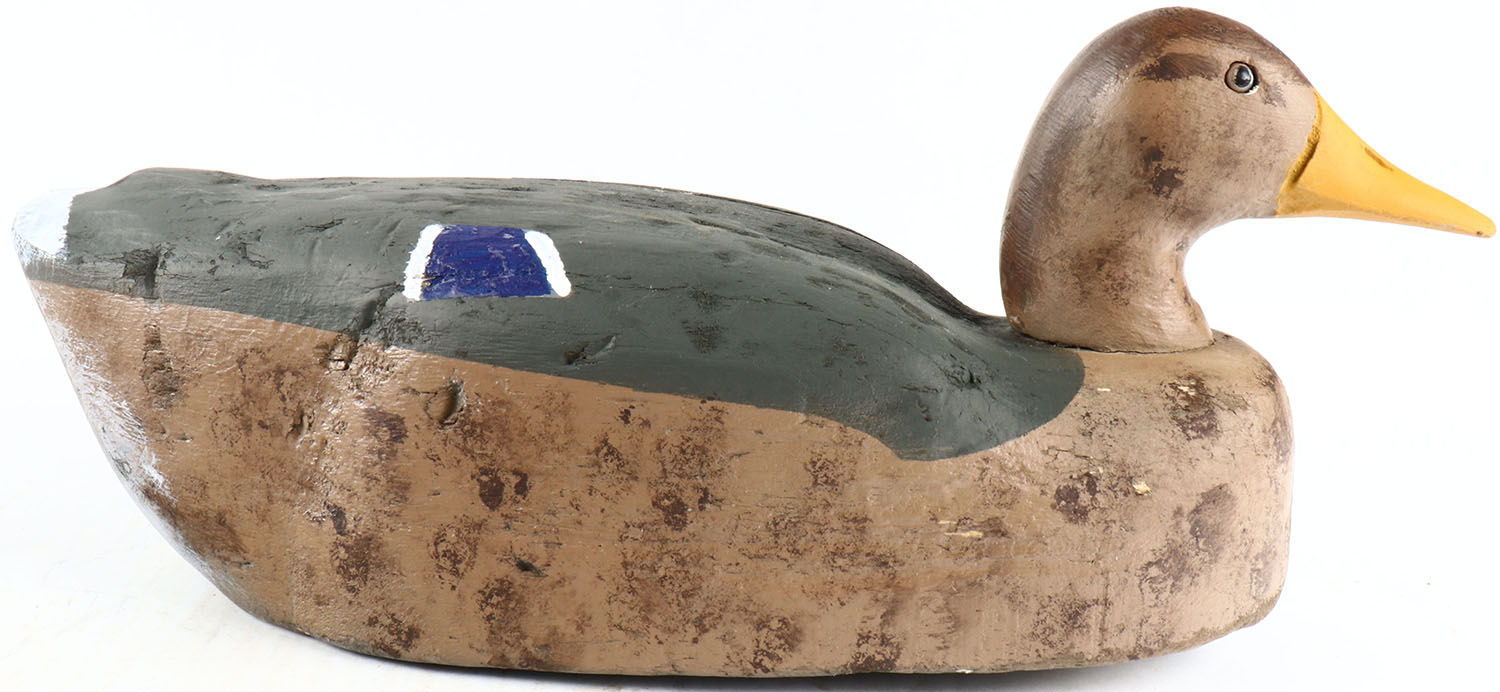 Mallard Hen by unknown maker, glass eyes, solid balsa wood, original paint, has age cracks on back and bottom. Grade: Very Good ++ - Value: 50 to 100