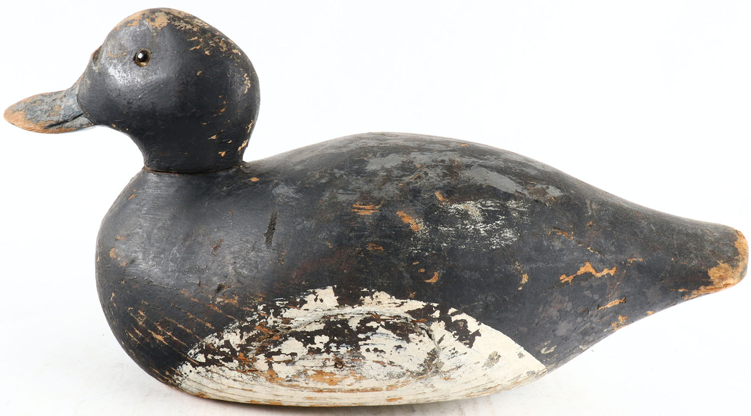 Bluebill Drake by unknown maker, glass eyes, solid wood, original paint, head is loose. Grade: Very Good ++ - Value: 50 to 100