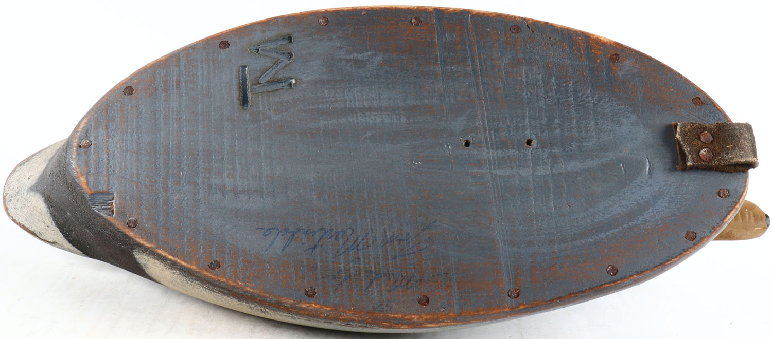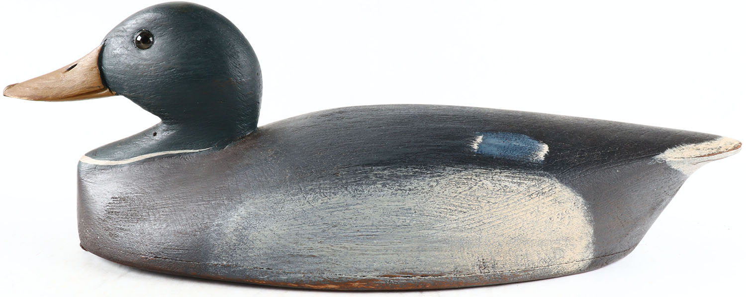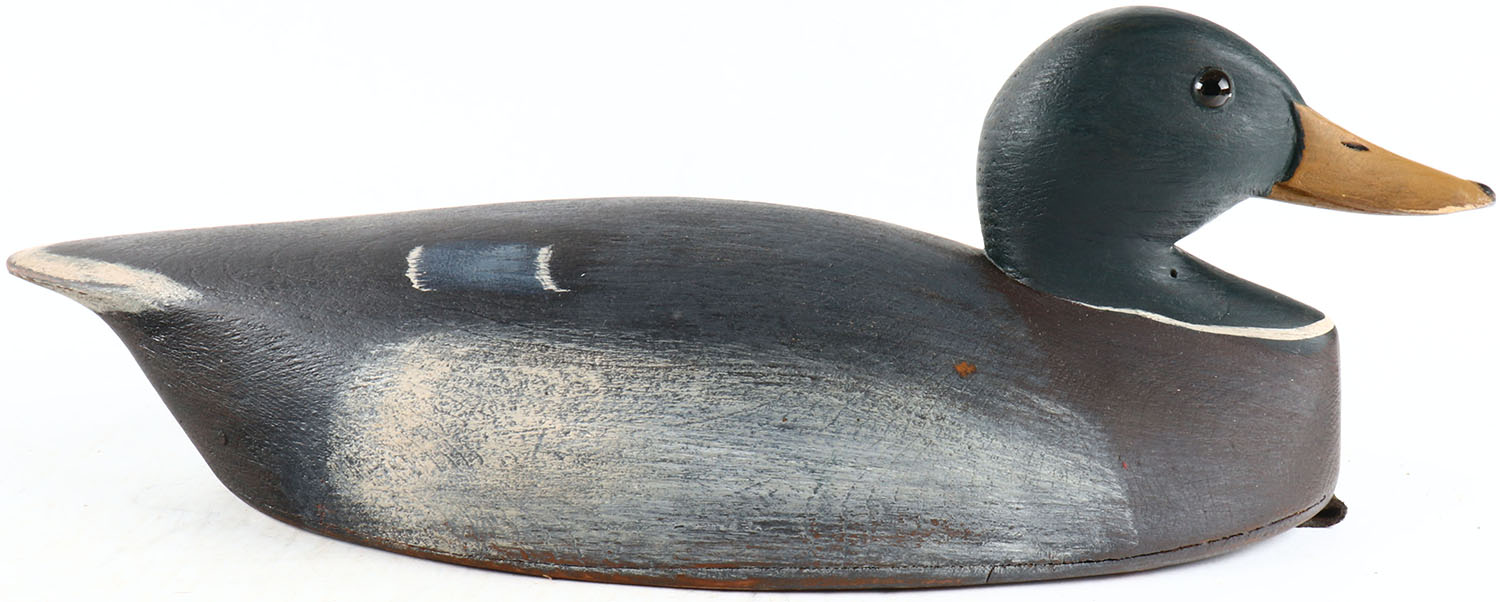 Mallard Drake by Tom Martindale, Ontario, Canada, glass eyes, hollow wood, original paint, structurally excellent, branded TM and signed on bottom. Grade: Excellent ++ - Value: 50 to 100