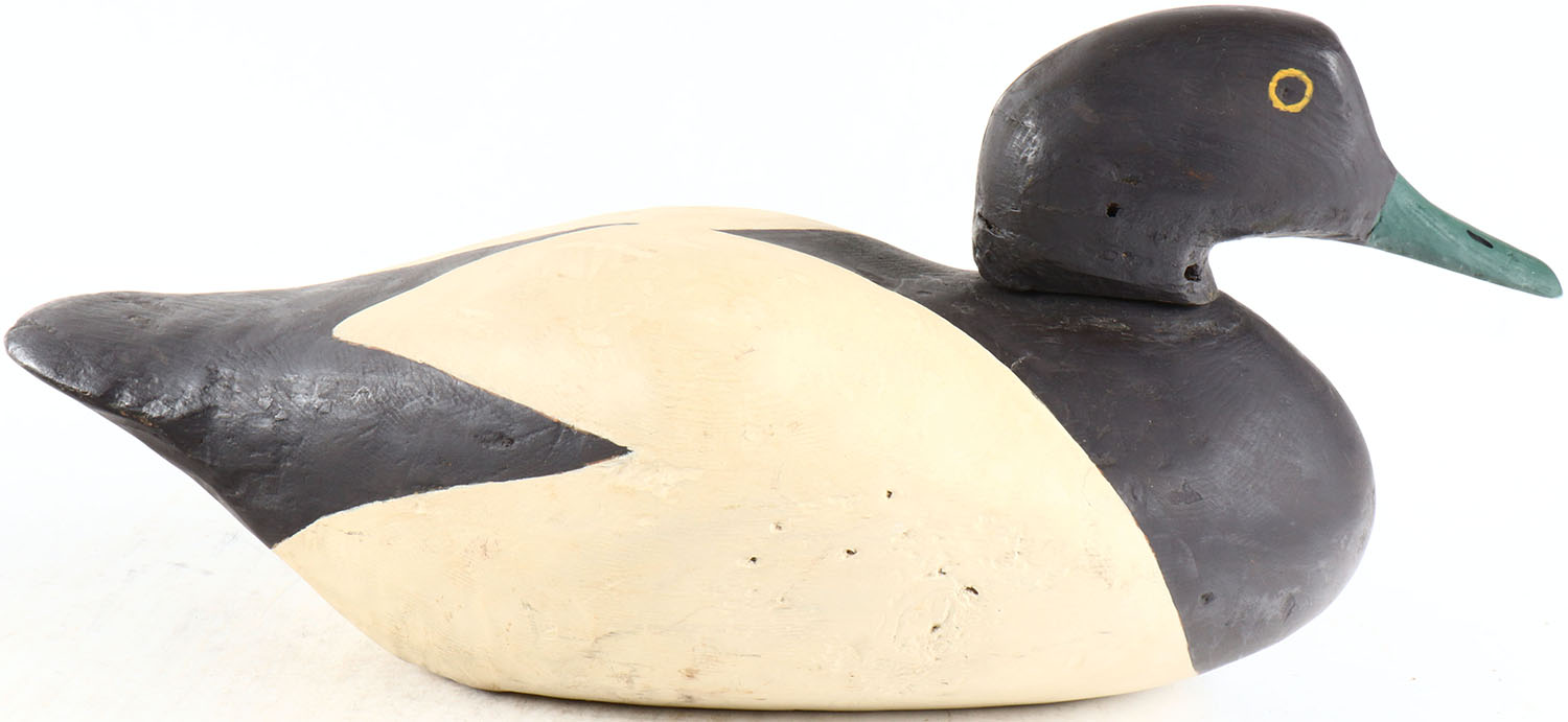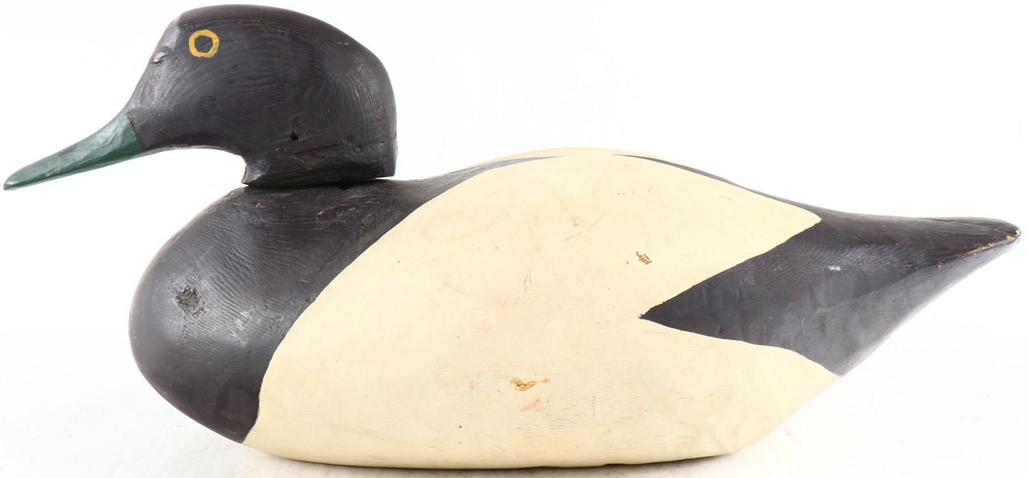 Bluebill Drake by unknown maker, painted eyes, solid wood, original paint, head comes off. Grade: Very Good ++ - Value: 50 to 100