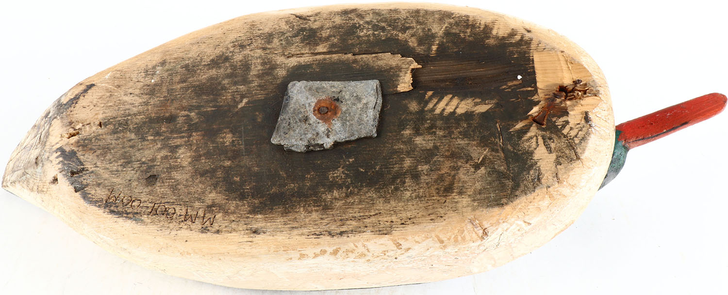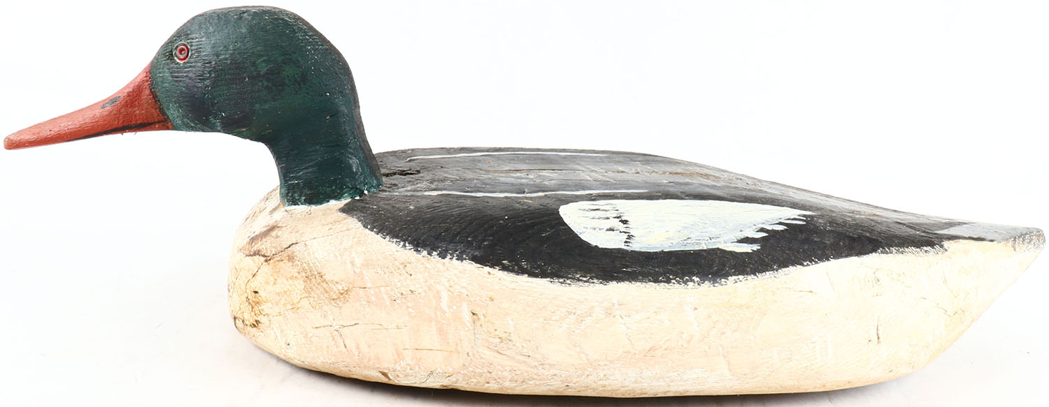 Merganser by unknown maker, tack eyes, solid wood, repainted, has age cracks on entire body. Grade: Vey Good + - Value: 50 to 100