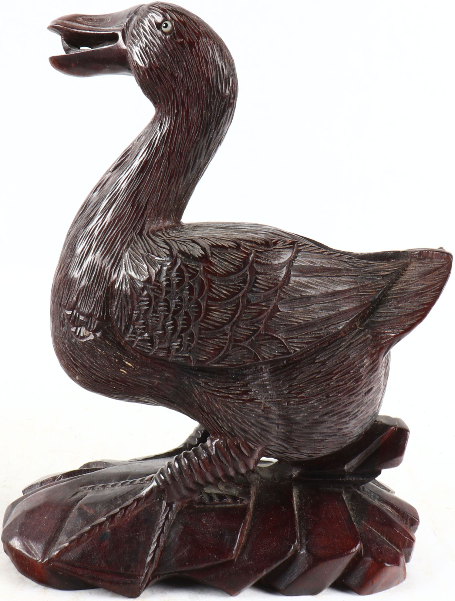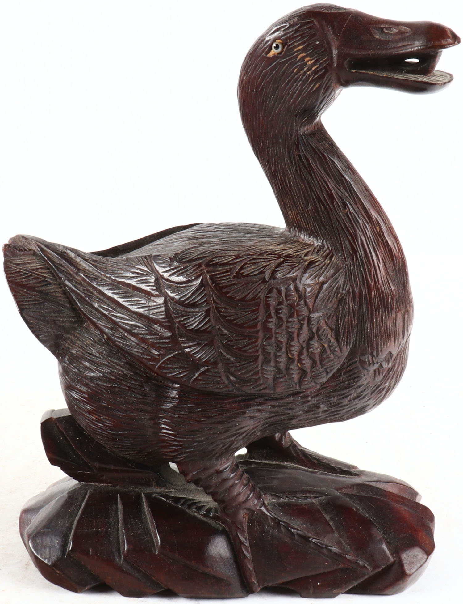Mallard duck with open mouth, glass eyes, solid wood, nice feather cavings, 5'' wide. Grade: Excellent - Value: 20 to 50