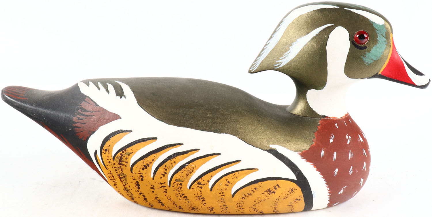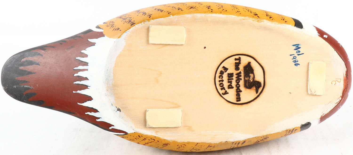 Woodduck Drake by The Wooden Bird Factory, glass eyes, solid wood, original paint, structurally excellent, branded by THE WOODEN BIRD FACTORY on bottom. Grade: MINT - Value: 50 to 100