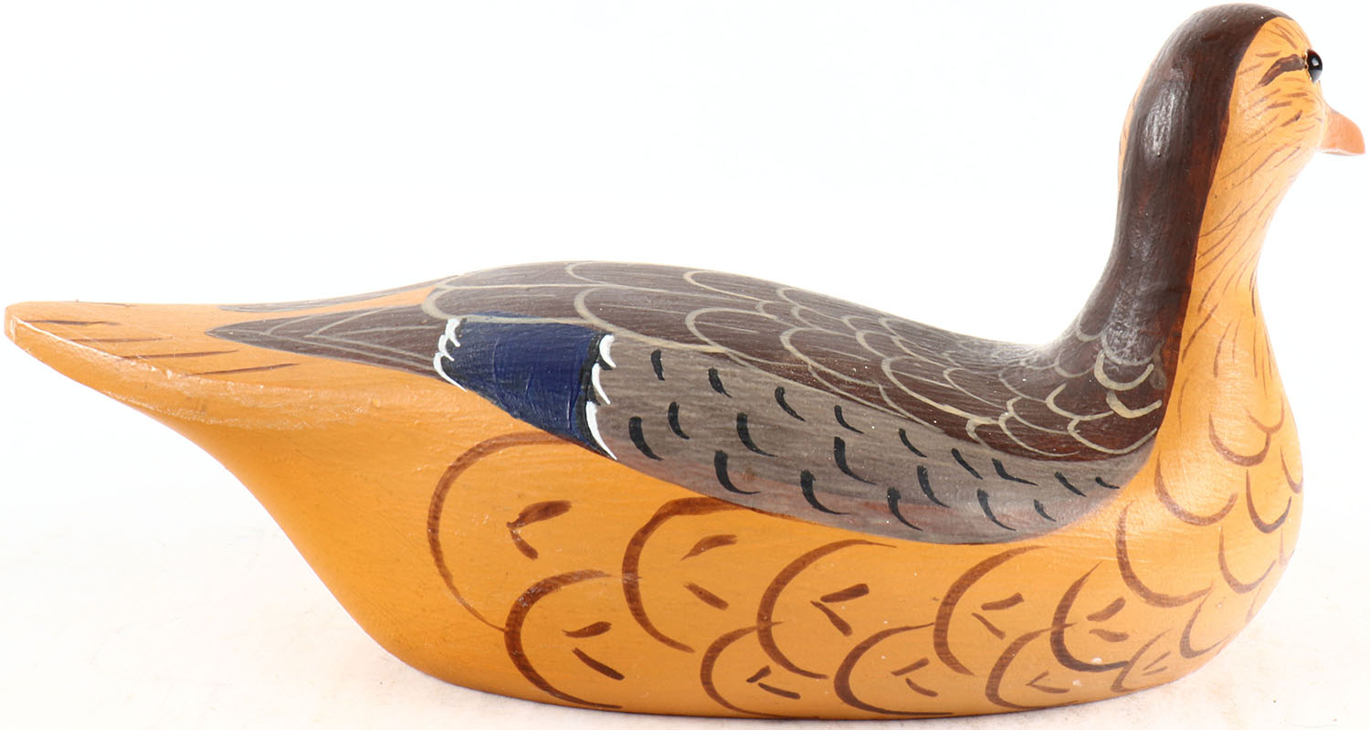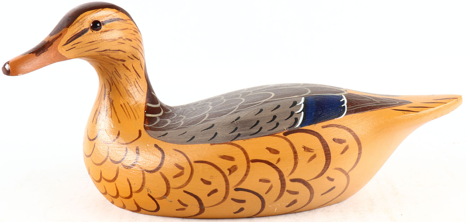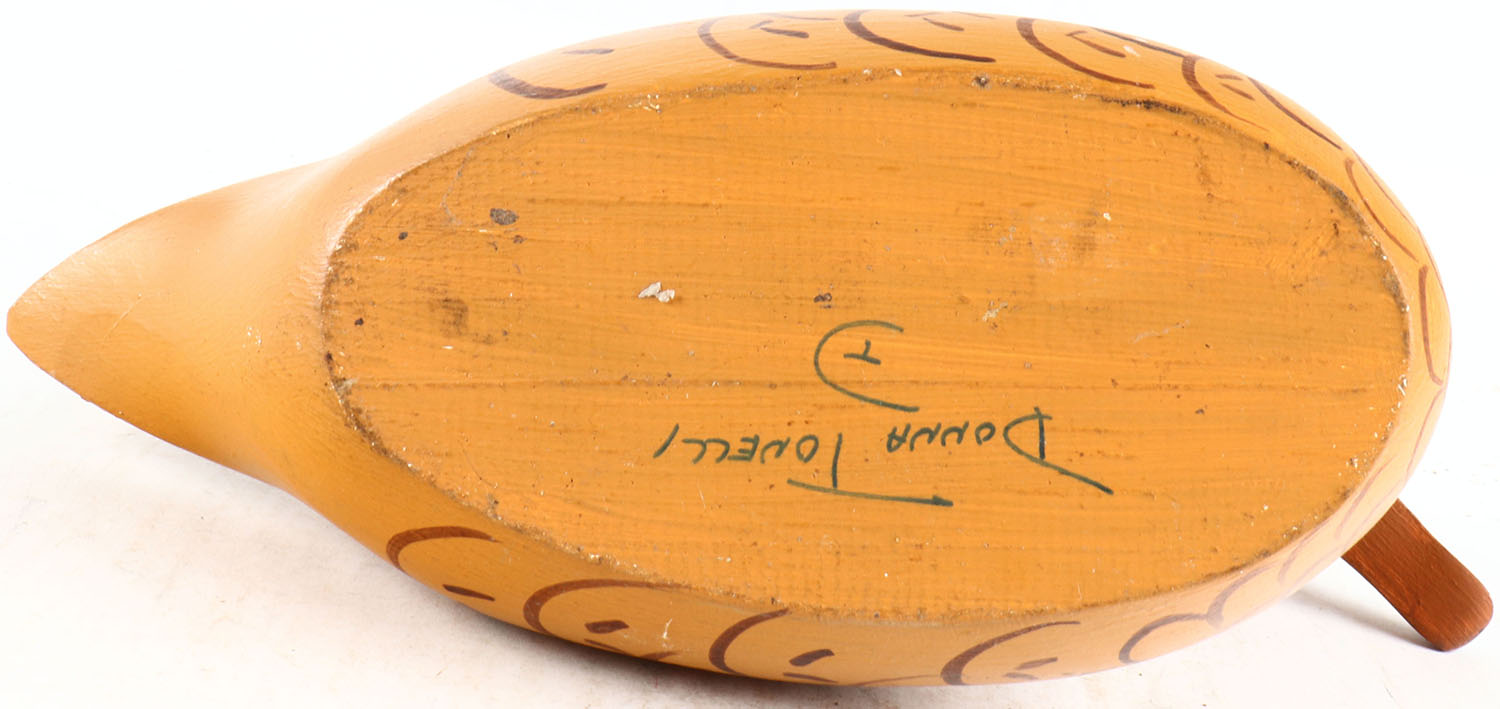 Mallard Hen by Donna Tonelli, glass eyes, solid wood, original paint, structurally excellent, signed on bottom. Grade: MINT - Value: 50 to 100