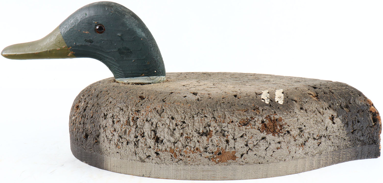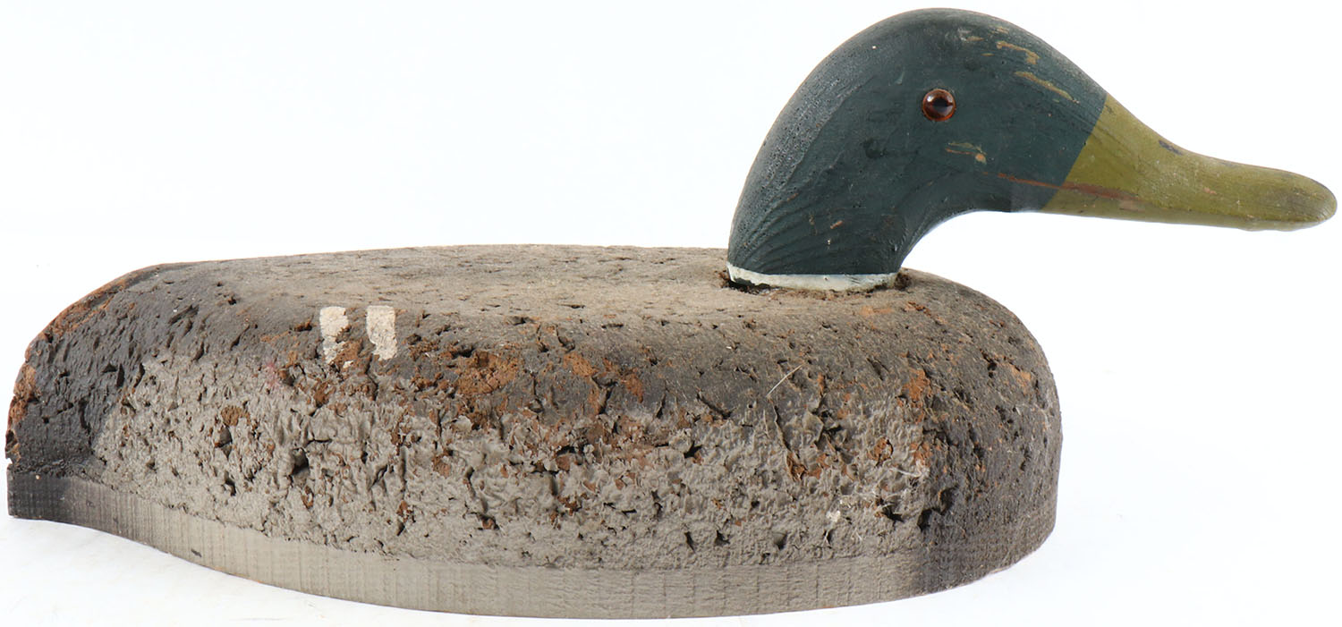 Mallard Drake by unknown maker, glass eyes, solid cork body, original paint, structurally excellent. Grade: Excellent + - Value: 50 to 100