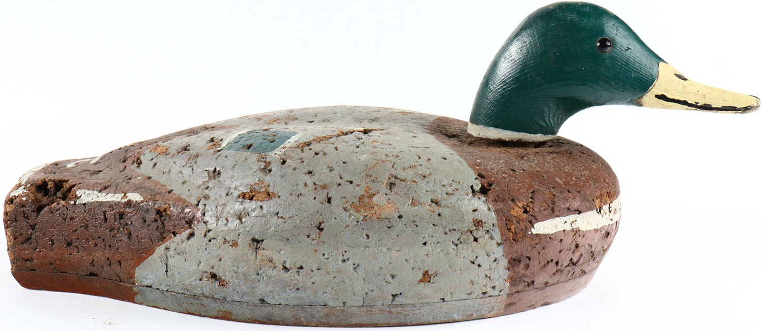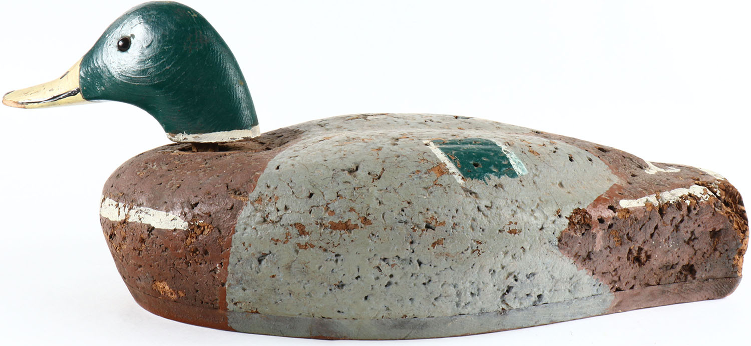 Mallard Drake by unknown maker, glass eyes, solid cork body, original paint, head comes off. Grade: Very Good ++ - Value: 50 to 100