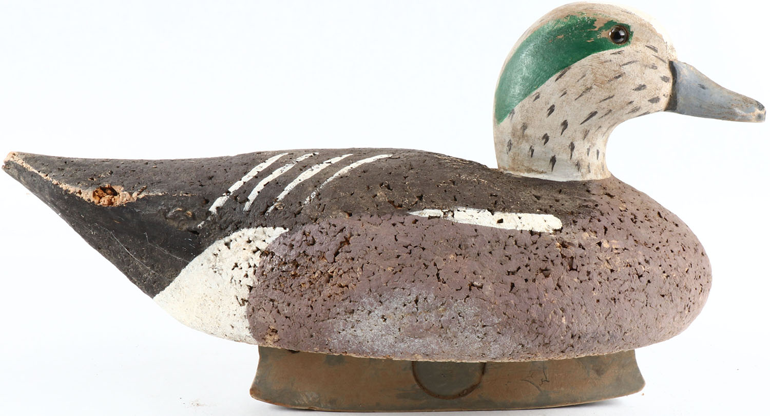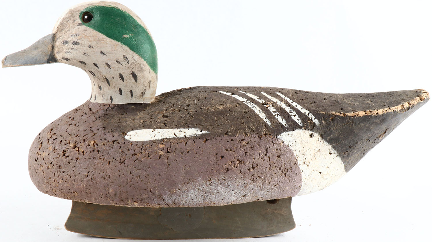 Widgeon by unknown maker, glass eyes, solid cork body, original paint, structurally excellent. Grade: Excellent + - Value: 50 to 100