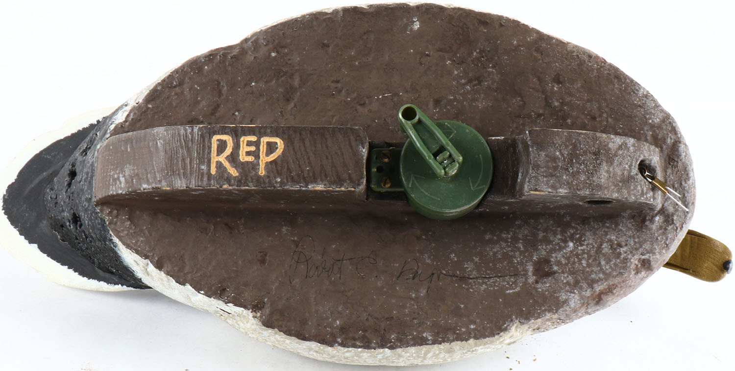 Mallard Drake by REP, glass eyes, solid cork body, original paint, structurally excellent, signed on bottom. Grade: MINT - Value: 50 to 100
