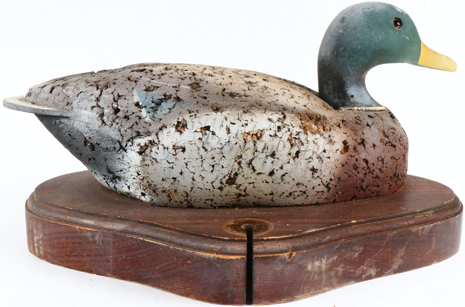 Mallard Drake by unknown maker, glass eyes, solid cork body on wood base, original paint, structurally excellent. Grade: Excellent - Value: 50 to 100