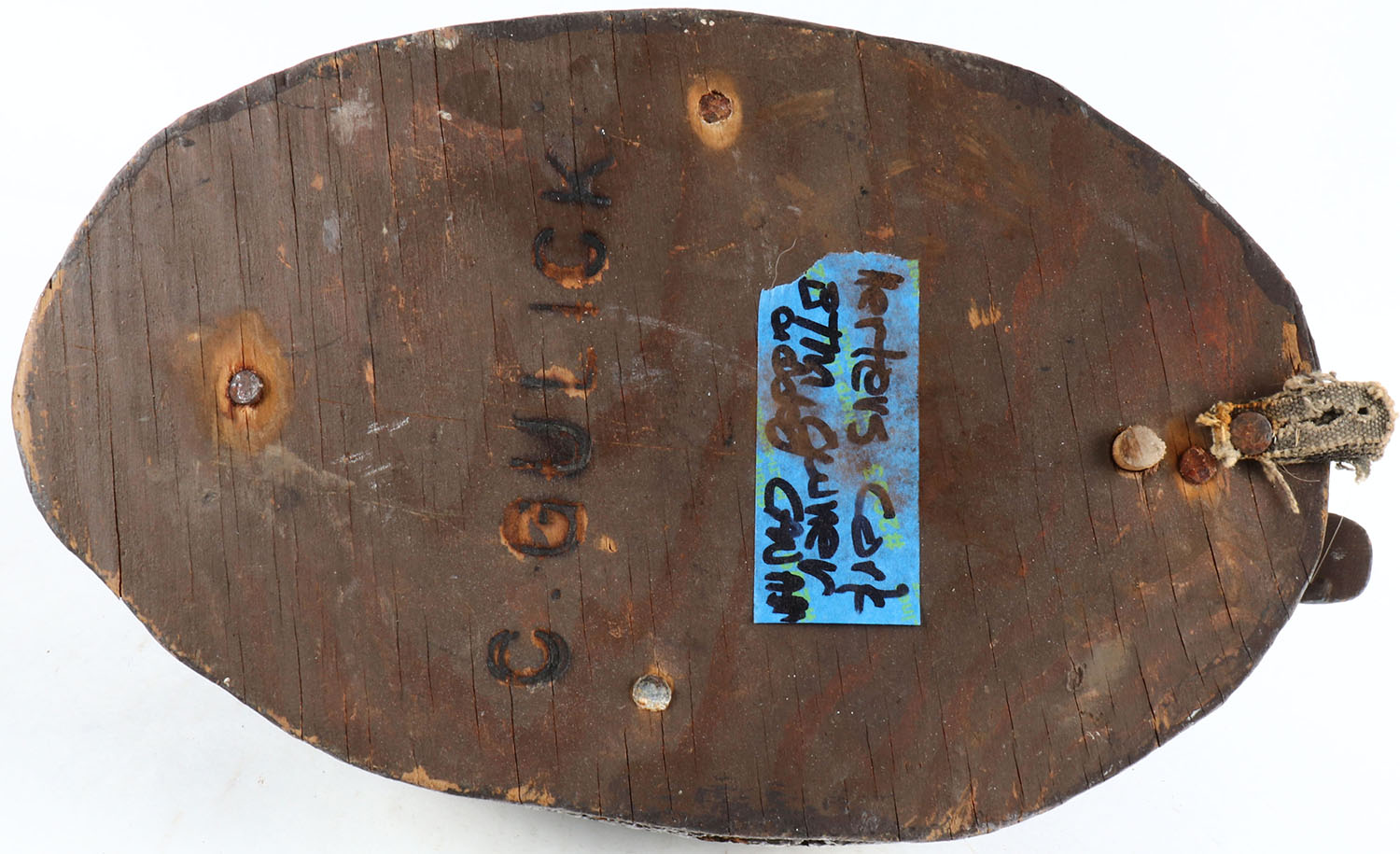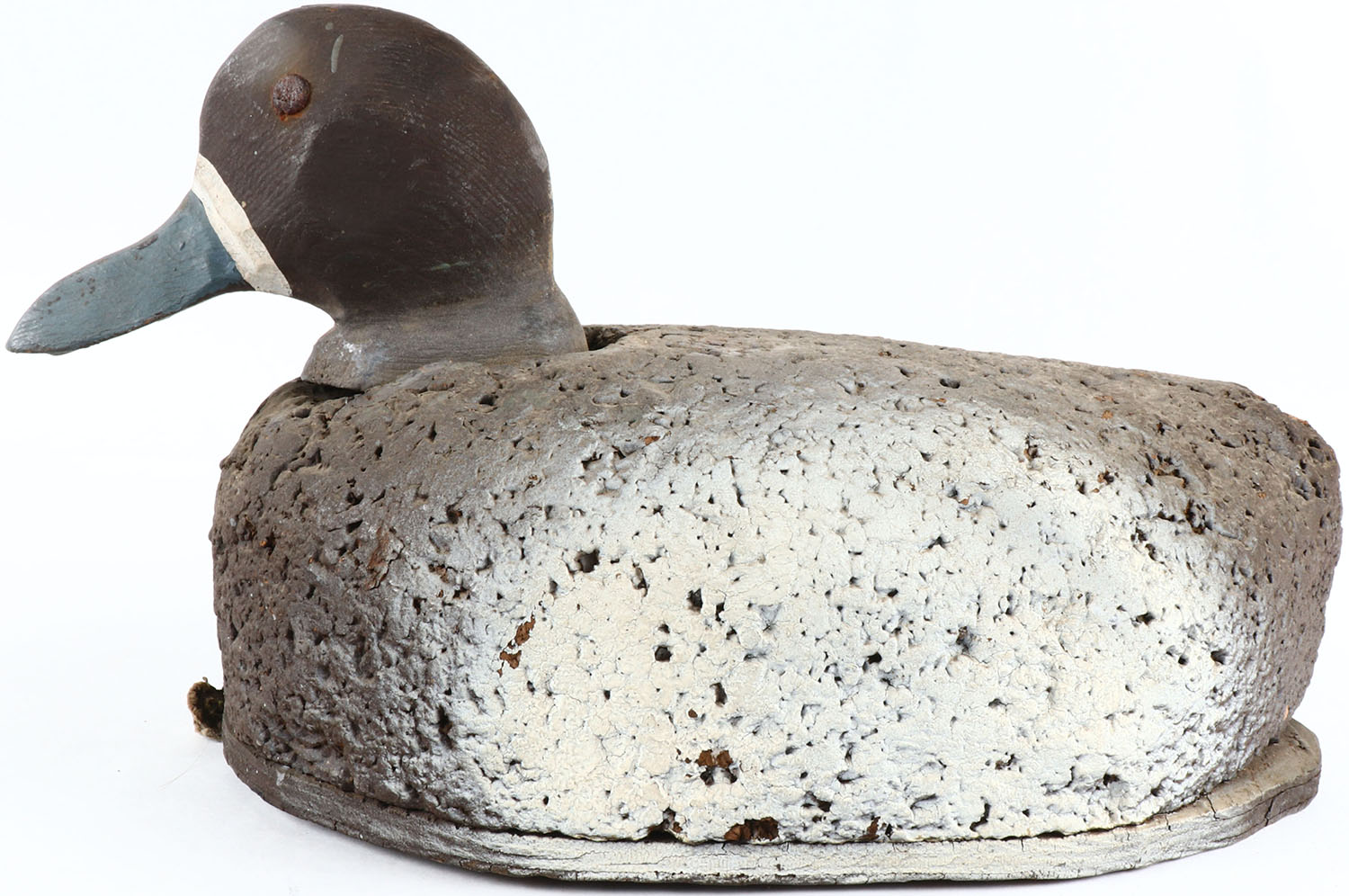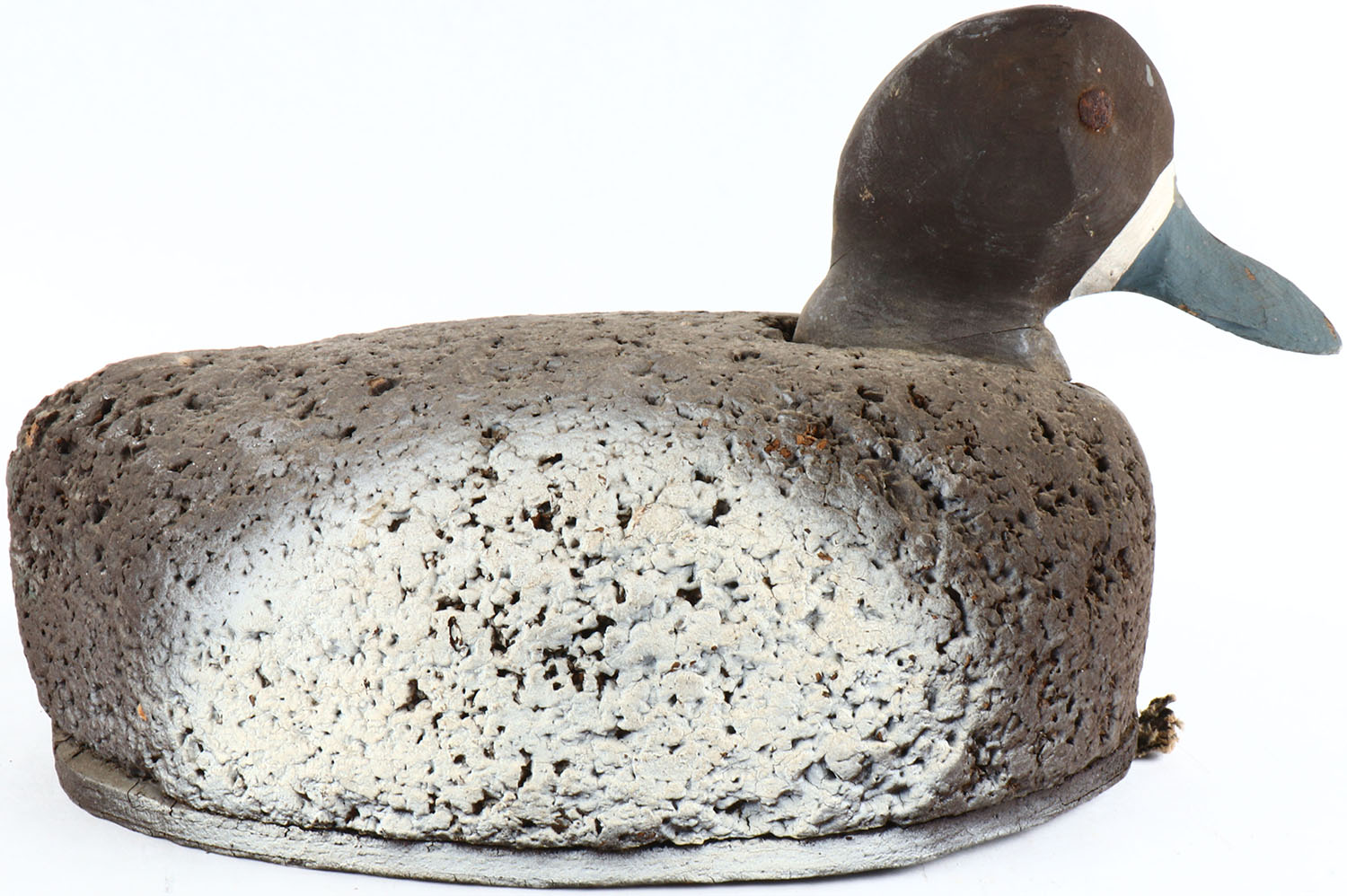 Bluebill Hen by G. Gulick, Herter's Inc., tack eyes, solid cork body, original paint, structurally excellent. Grade: Excellent ++ - Value: 50 to 100