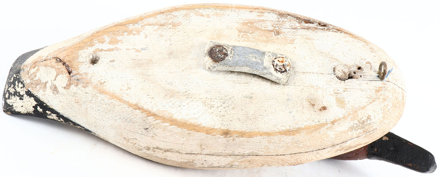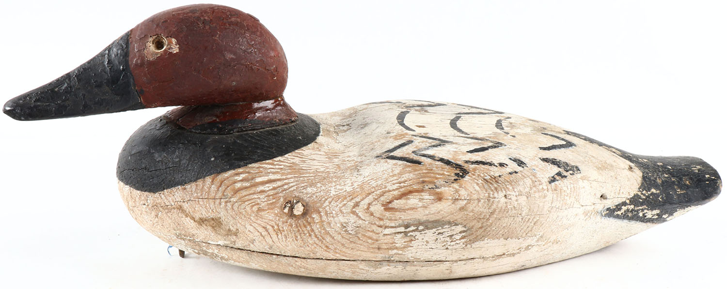 Canvasback Drake by unknown maker, glass eyes, one is missing, solid wood, original paint. Grade: Very Good + - Value: 50 to 100