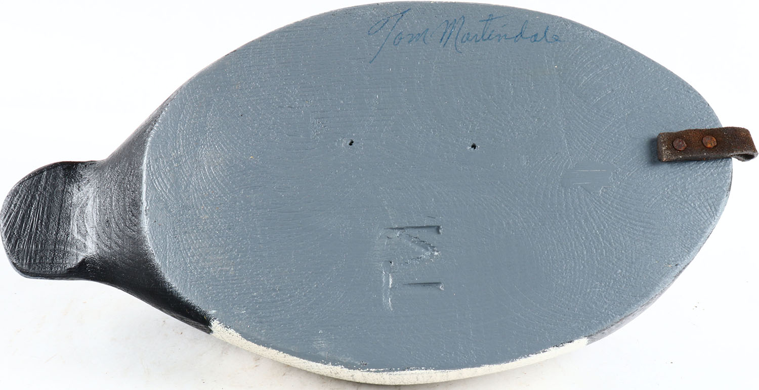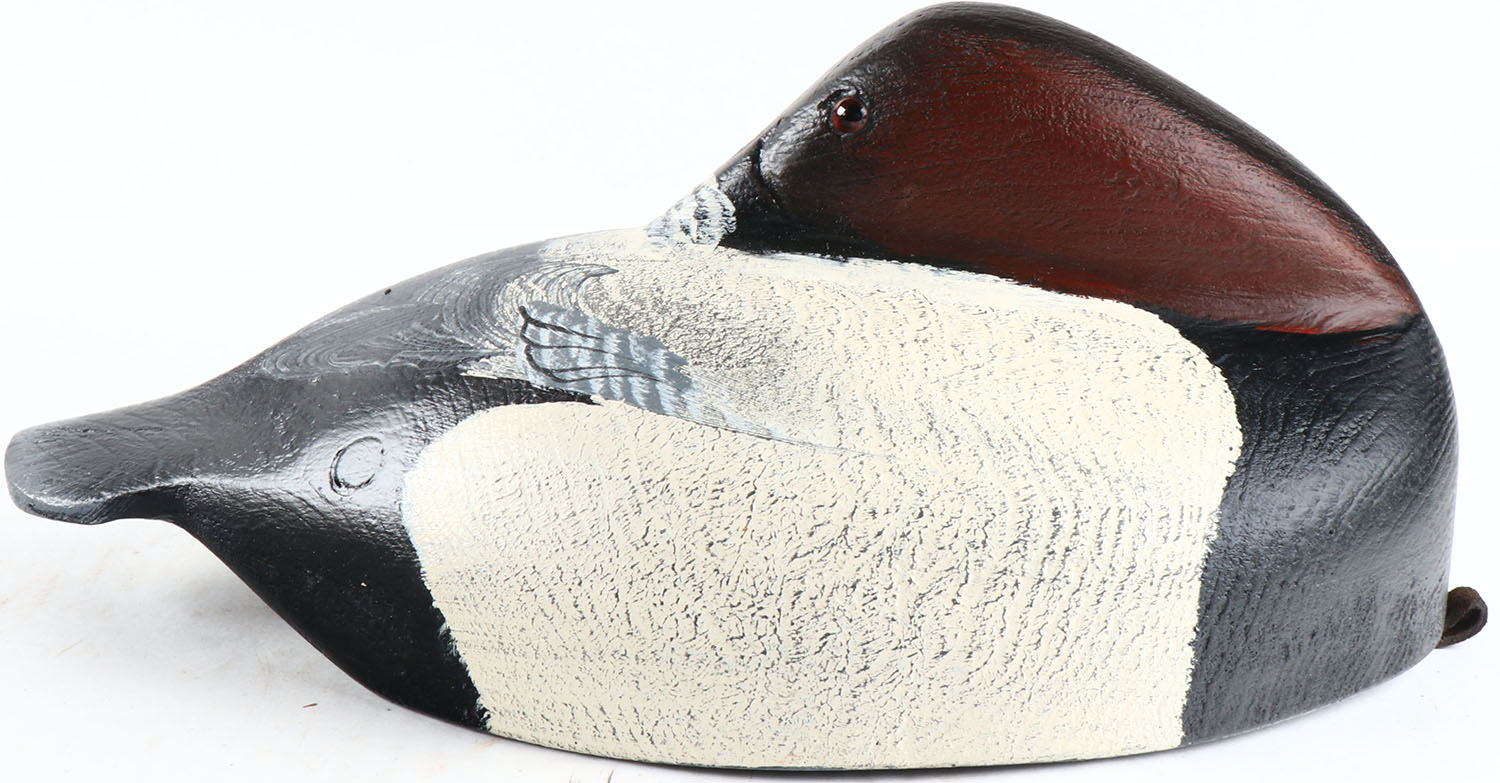 Sleeping Canvasback Drake by Tom Martindale, Ontario, Canada, glass eyes, solid wood, original paint, structurally excellent, branded TM and signed on bottom. Grade: MINT - Value: 50 to 100