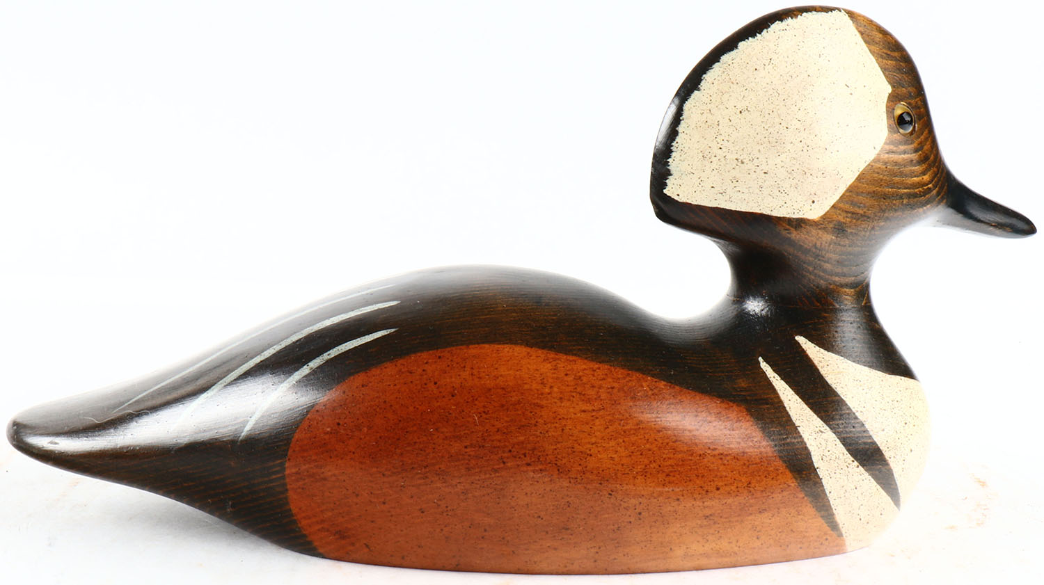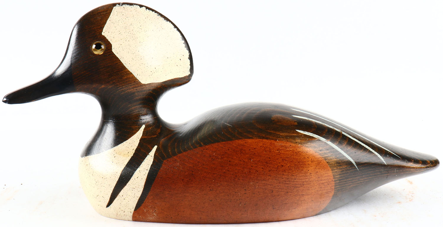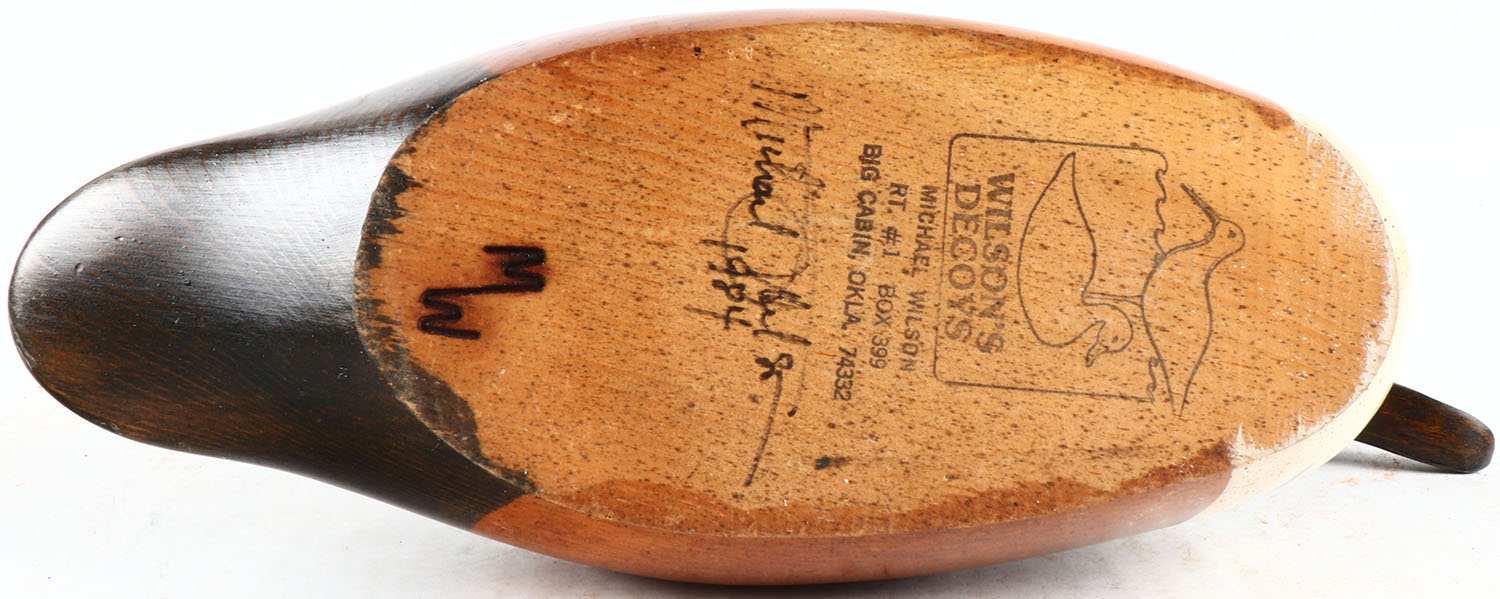 Hooded Merganser by Wilson's Decoys, Big Cabin, Okla, glass eyes, solid wood, original paint, structurally excellent, branded and signed on bottom. Grade: MINT - Value: 50 to 100