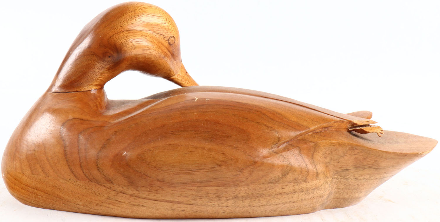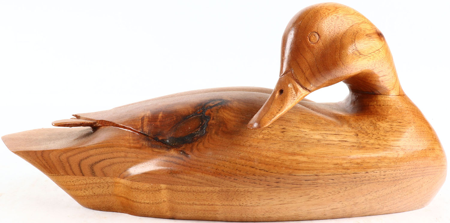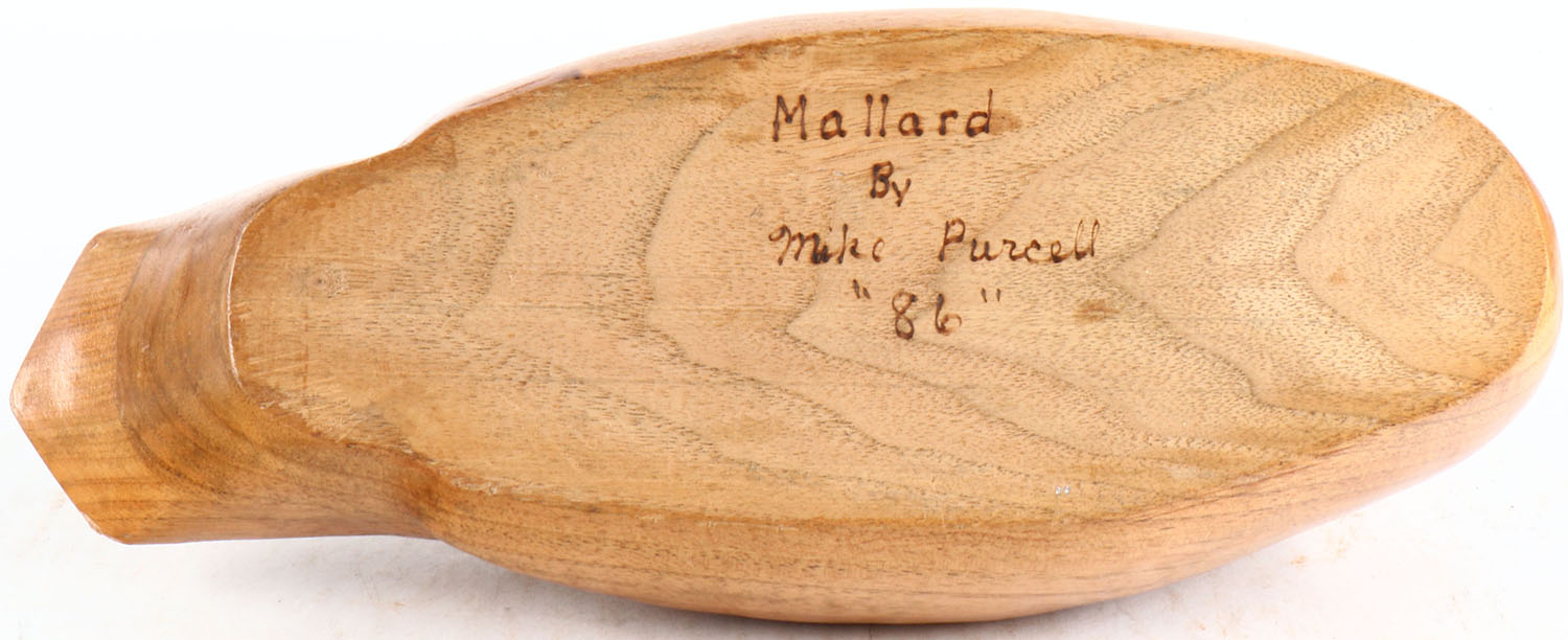 Preening Mallard Hen by Mike Purcell, carved eyes, solid wood, structurally excellent, signed on bottom. Grade: MINT - Value: 10 to 50