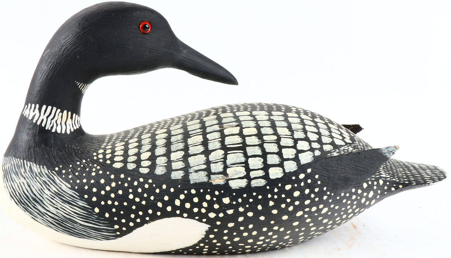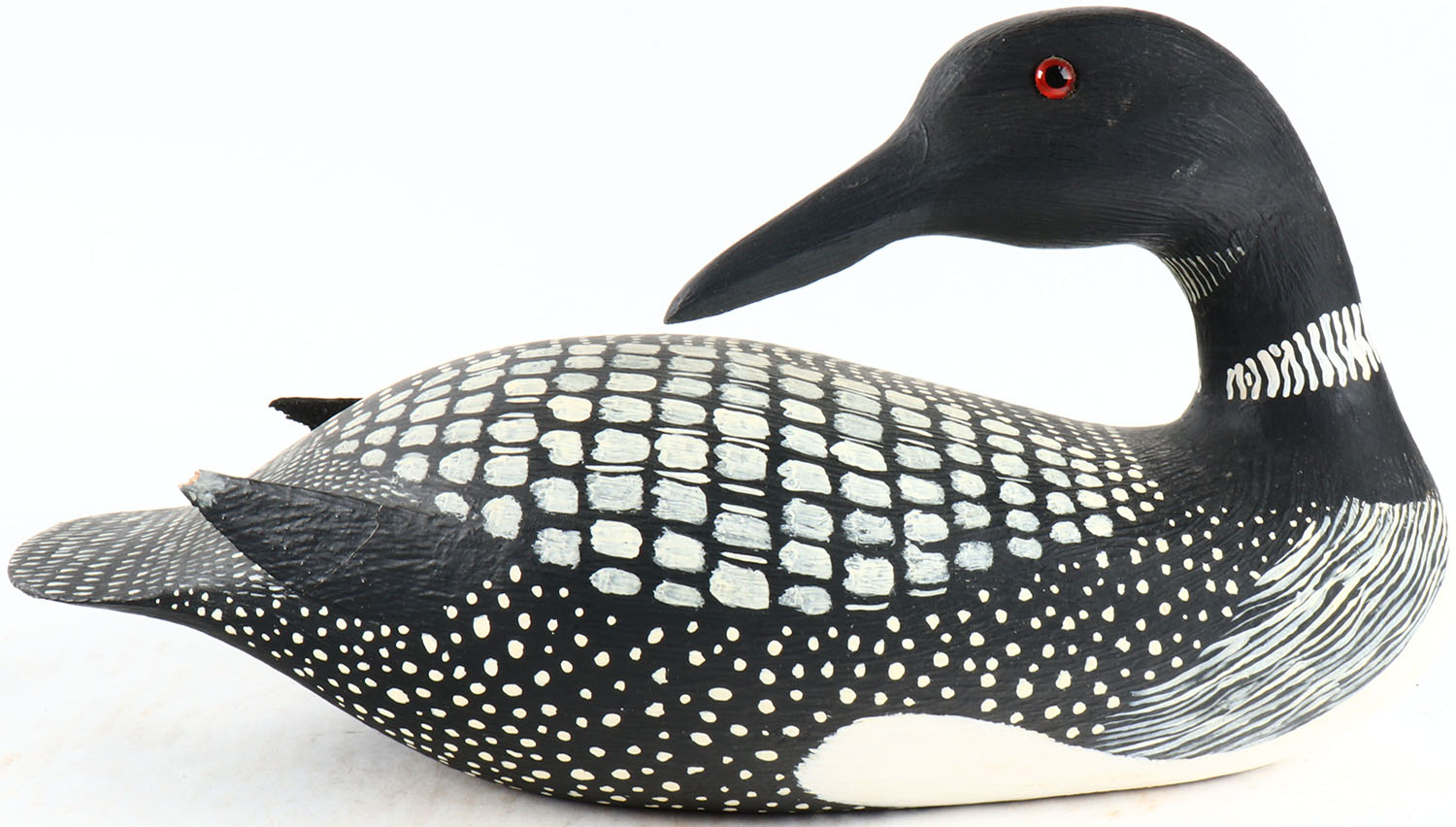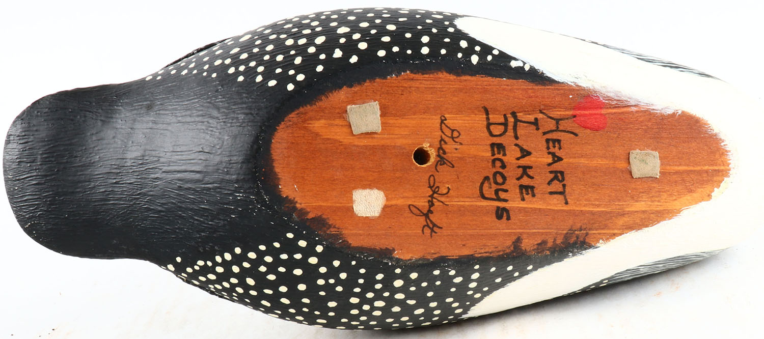 Preening Loon by Heart Lake Decoys, Dick Hoeft, glass eyes, solid wood, original paint, structurally excellent, signed on bottom. Grade: MINT - Value: 20 to 60