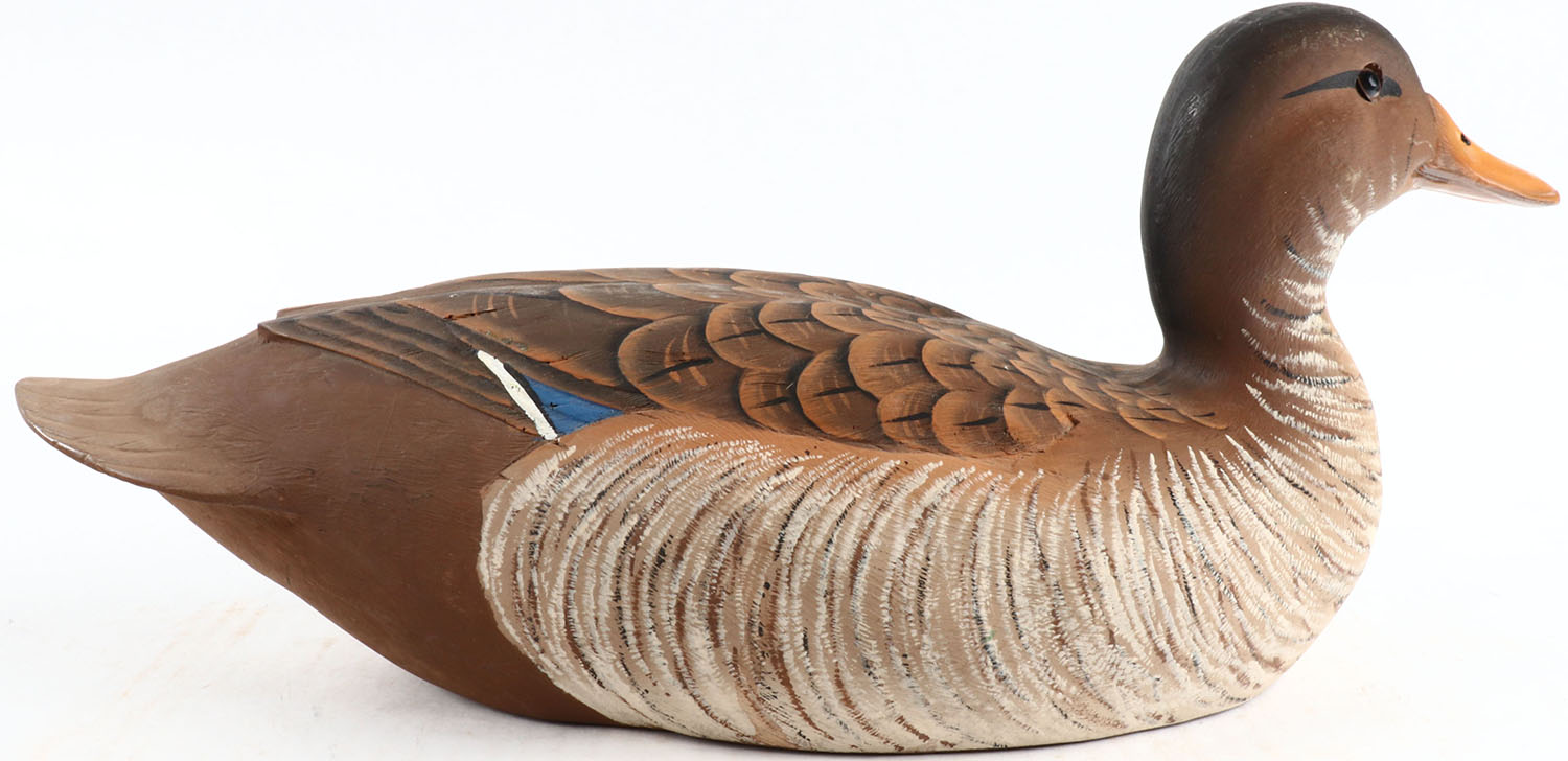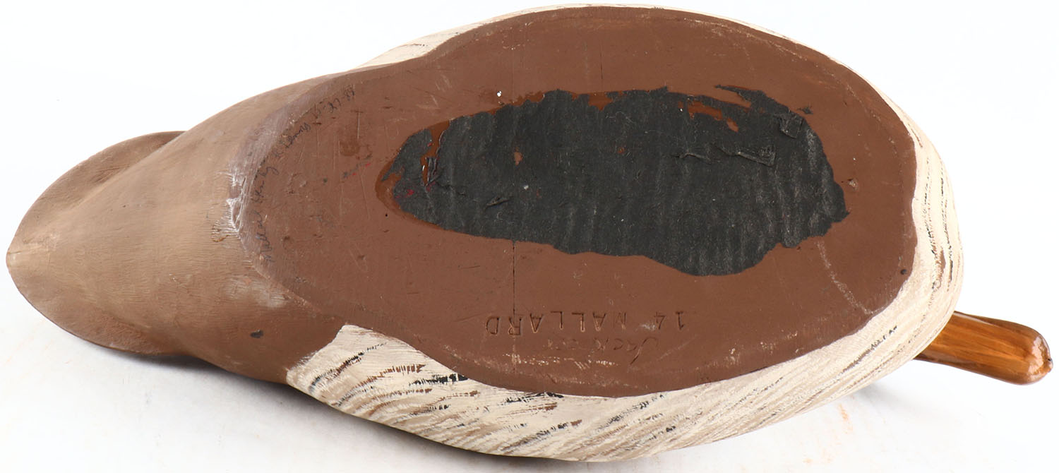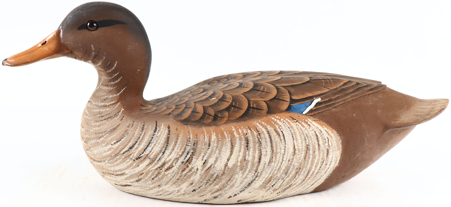 Mallard Hen by Jack Cox, Glass eyes, hollow wood, original paint structurally excellent, signed on bottom. Grade: MINT - Value: 100 to 300