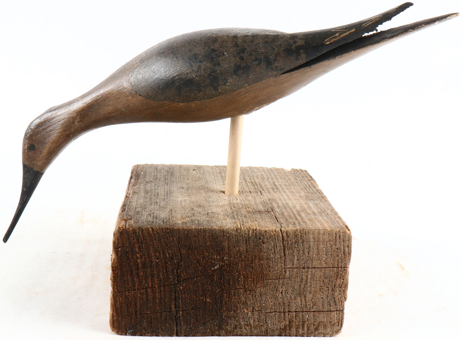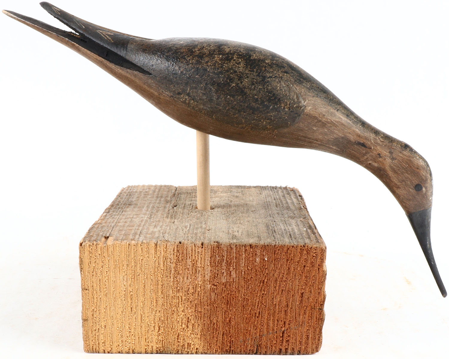 Shorebird marked ''B'', painted eyes, solid wood on wood stand, original paint, structurally excellent. Grade: Excellent - Value: 40 to 100