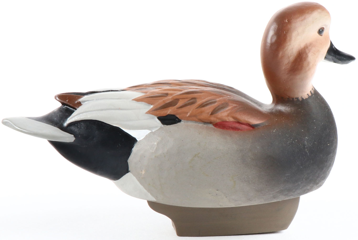 Miniature Gadwall by Jett Brunet, Ducks Unlimited, Memphis, TN. Painted eyes, solid wood, original paint, structurally excellent, branded on bottom, in original box, Grade: MINT + - Value: 6 to 30