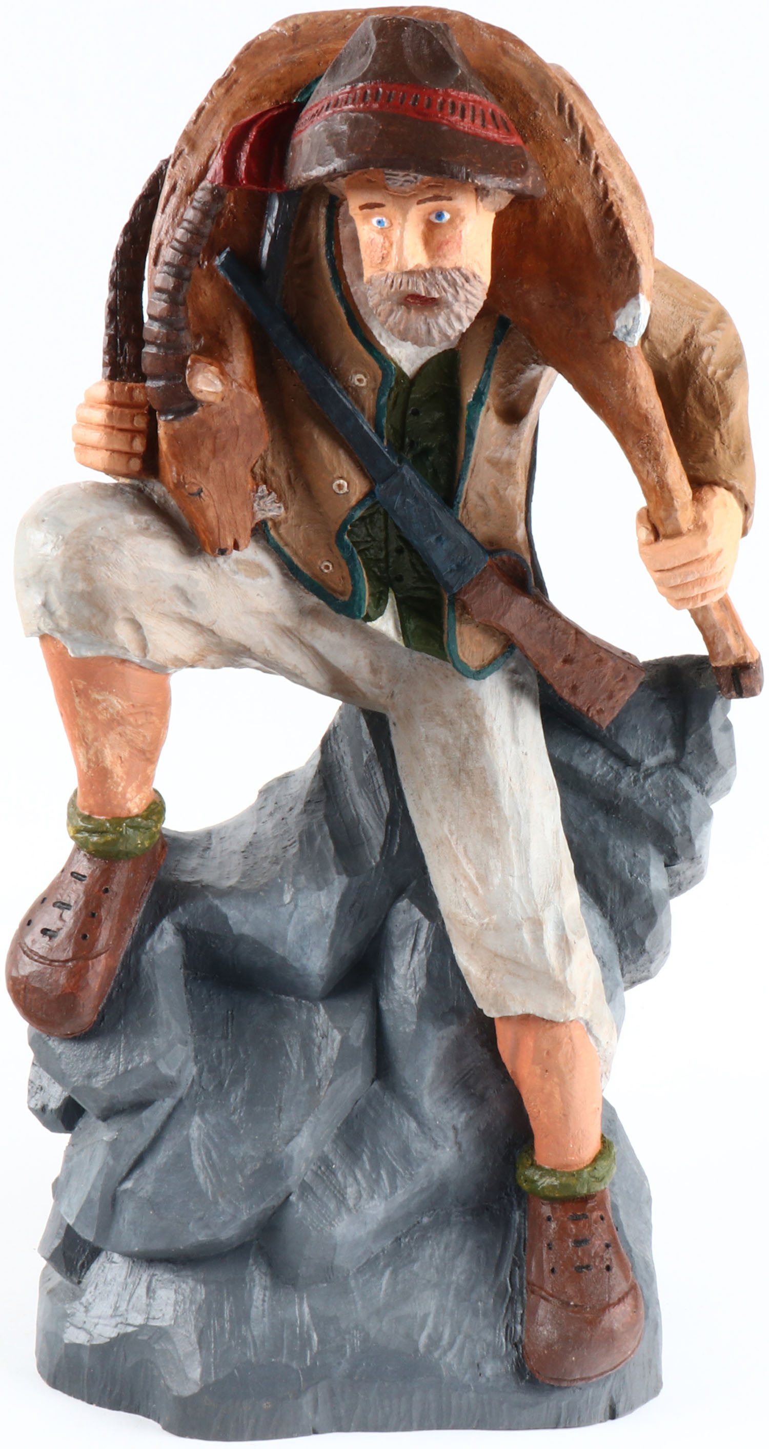 Hand carved & painted by G.W., has hunters carrying a Blesbok? With gun on front, 10'' x 17''. Grade: Excellent - Value: 6 to 30
