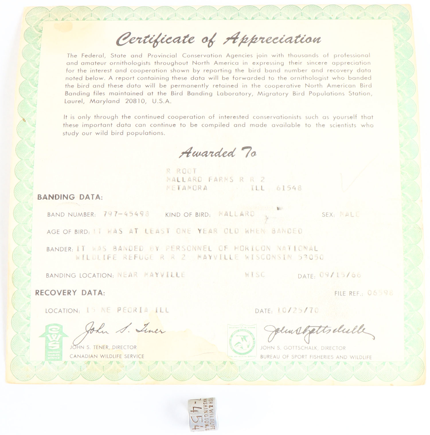 DUCK BAND with certificate from 1966, we are offering a few duck bands that were all shot at one duck club in Peoria IL from 1964 - 1999, ''MALLARD FARMS R R 2'', this one has a certificate, this one was banded in Near Mayville Wisc 09/15/1966 and shot 10/25/1970. Grade: Excellent - Value: 30 to 100