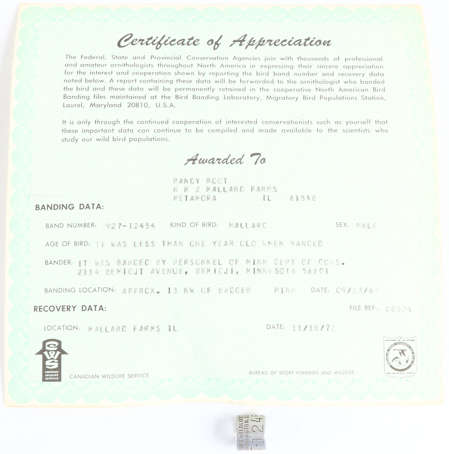 DUCK BAND with certificate from 1968, we are offering a few duck bands that were all shot at one duck club in Peoria IL from 1964 - 1999, ''MALLARD FARMS R R 2'', this one has a certificate, this one was banded in Near Badger Minn 09/23/1968 and shot 11/18/1972. Grade: Excellent - Value: 30 to 100