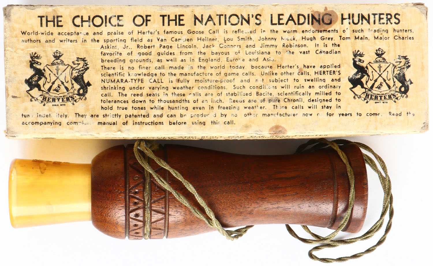 Herters No. 377 NUMARA-TYPE Goose Call in the original box, call is wood with amber stopper, has hand carved patter near lanyard rings, box is excellent. Grade: Excellent - Value: 10 to 30