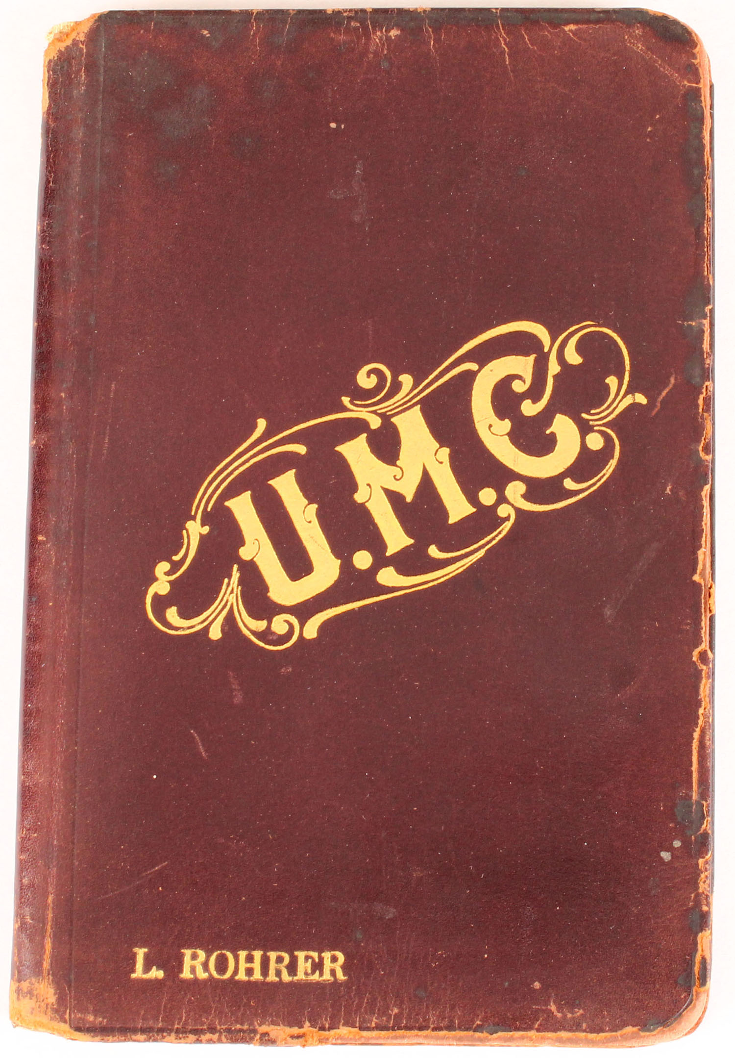U.M.C. Price List of Metallic Cartridges Paper and Brass Shot Shells, Gun Wads, Primers, Percussion Caps, Loaded Shells, Etc. 1897 by L. Rohrer. 4'' x 6 1/2''. 42 pages, pages clean, binding tight, softcover good. Grade: Very Good + - Value: 10 to 200