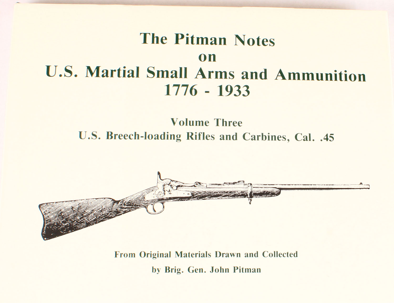 The Pitman Notes on U.S. Martial Small Arms and Ammunition 1776-1933 Volume Three U.S. Breech-loading Rifles and Carbines, Cal. 45 by John Pitman, 8 1/2'' x 11''. 186 pages, pages clean, binding tight, hardcover and dustjacket excellent, b/w images. Value: $230 Grade: MINT - Value: 20 to 230